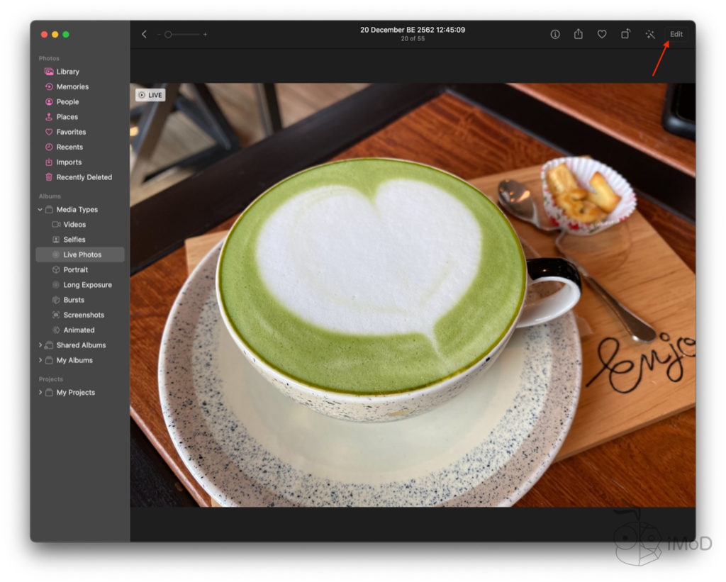 ไปที่แอปรูปภาพ (Photos) > อัลบั้ม Live Photos > เลือกรูปภาพ Live Photos ที่ต้องการ > แตะแก้ไข (Edit)