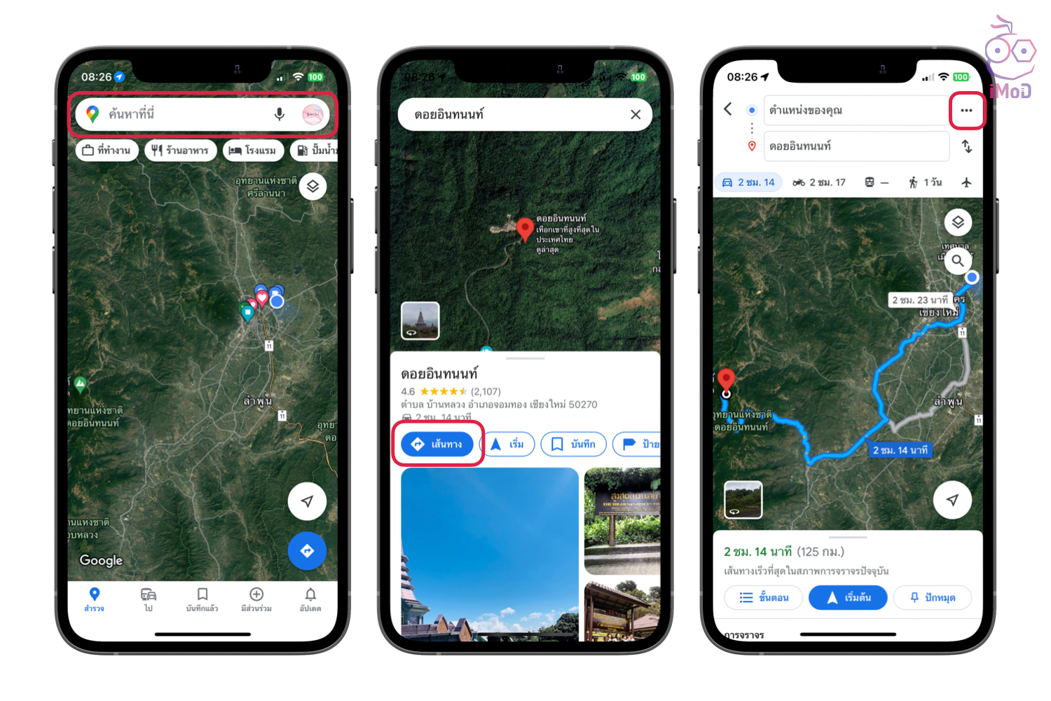 ไปที่แอป Google Maps > แตะช่องค้นหา > ค้นหาสถานที่ปลายทางที่จะเดินทางไป แล้วแตะ เส้นทาง > แตะไอคอน 3 จุด ด้านบนมุมขวา