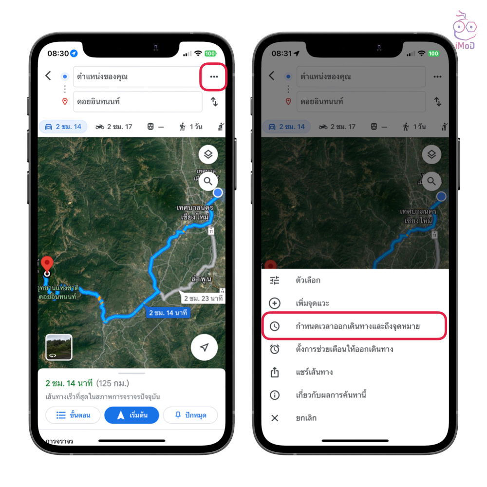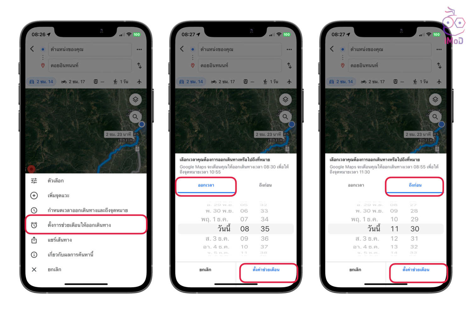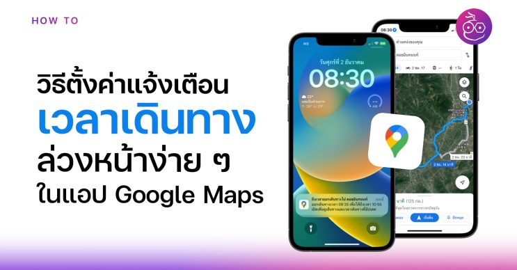 เลือก ตั้งการช่วยเตือนให้ออกเดินทาง (Set a reminder to leave) > แตะแถบออกเวลา แล้วตั้งค่าวันที่และเวลาออกเดินทาง แล้วแตะ ตั้งค่าช่วยเตือน หรือถ้าหากเราต้องการตั้งเวลาที่ถึงปลายทาง ก็สามารถแตะแถบ ถึงก่อน แล้วตั้งเวลาที่จะถึง จากนั้นก็แตะตั้งค่าช่วยเตือนได้เลย แอปก็จะคำนวณเวลาที่ต้องออกเดินทางให้อัตโนมัติ พร้อมกับเวลาที่ต้องแจ้งเตือนก่อน