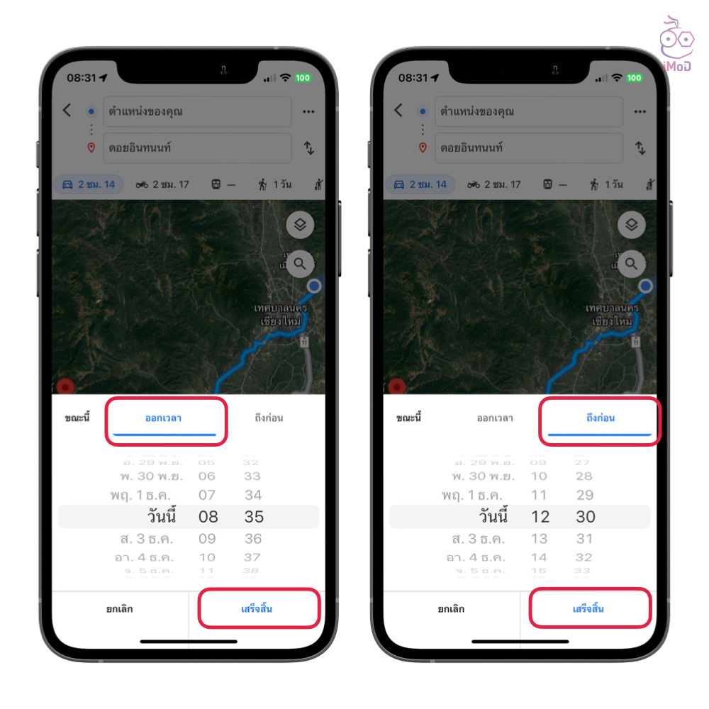 จากนั้นก็กำหนดเวลาที่ต้องการออกเดินทางได้เลย ในแถบ ออกเวลา แอปก็จะคำนวณเวลาที่ใช้ในการเดินทาง รวมถึงเวลาที่จะถึงให้ทราบ หรือในแถบถึงก่อน เราก็สามารถกำหนดเวลาถึงได้ แอปก็จะคำนวณเวลาที่ต้องออกเดินทางและเวลาในการเดินทางแจ้งให้ทราบ เพื่อให้เราเตรียมตัวในการเดินทางได้