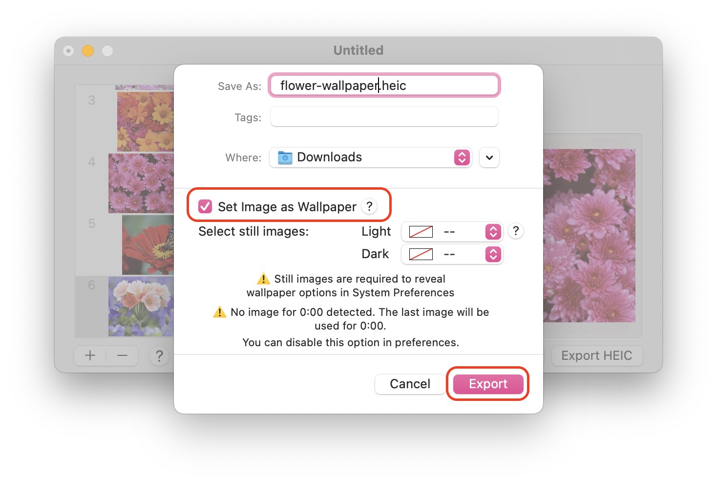 ตั้งชื่อไฟล์ และเลือกตำแหน่งที่เก็บไฟล์  > ติ๊กเลือก Set Image as Wallpaper แล้วคลิก Export > ภาพพื้นหลังก็จะเปลี่ยนตามเวลาที่เรากำหนดนั่นเอง