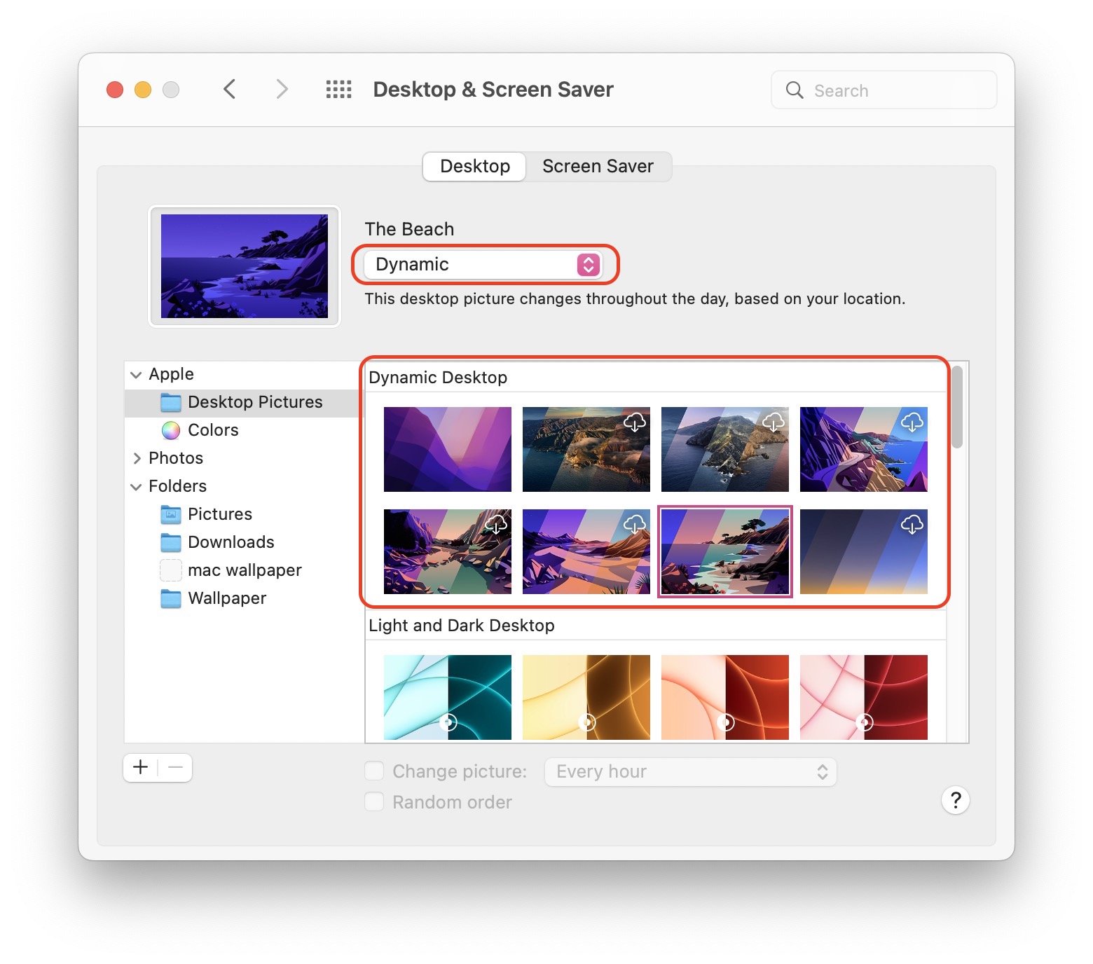 ตั้งค่าได้โดยไปที่ System Preferences > Desktop & Scree Saver > เลือกโฟเดอร์ Desktop Picture ด้านซ้ายมือ > ส่วน The Beach ให้เลือกเป็น Dynamic > ด้านขวา ก็เลือกภาพพื้นหลังไดนามิกที่ต้องการได้เลย