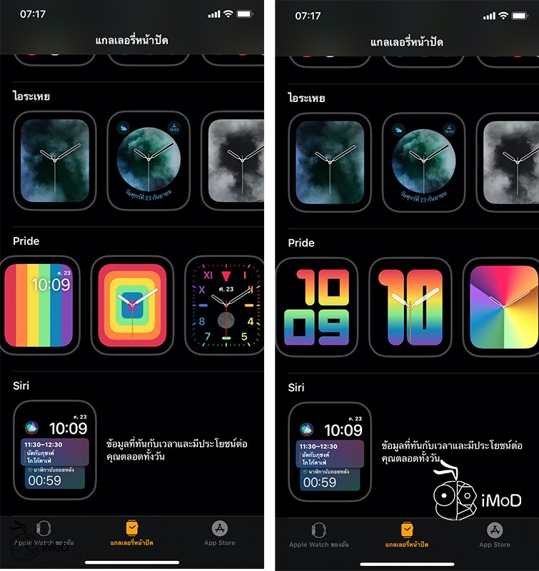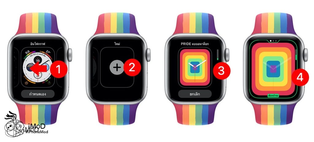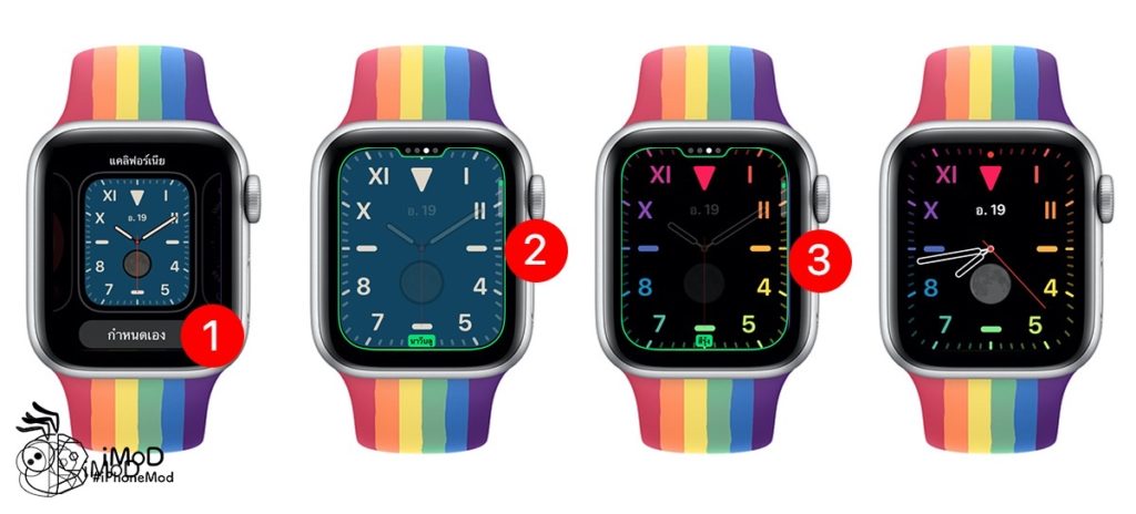 ส่วนวิธีการเปลี่ยนโทนสีหน้าปัดที่รองรับ (ทีมงานแนบหน้าปัดที่รองรับสีรุ้งไว้ด้านล่างบทความ) ให้กดน้ำหนักลงบนหน้าจอที่มีหน้าปัดที่รองรับ แล้วแตะ กำหนดเอง > เลื่อนปุ่ม Digital Crown เพื่อเลือก สีรุ้ง > เมื่อได้สีรุ้งแล้วให้กดปุ่ม Digital Crown เพื่อออกไปยังหน้าโฮม
