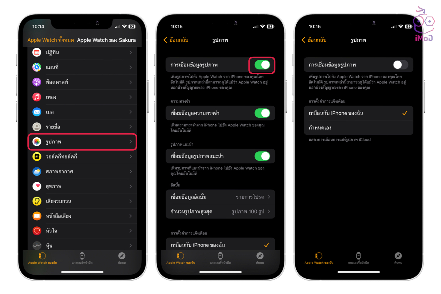 iPhone มีการเชื่อมต่อรูปภาพไปยังแอปรูปภาพบน Apple Watch อัตโนมัติ แต่การซิงค์นั้นก็ต้องใช้พื้นที่บน Apple Watch ค่อนข้างมาก ซึ่งอาจเป็นหนึ่งสาเหตุที่ทำให้ Apple Watch ช้า ดังนั้นถ้าหากเราไม่จำเป็นจะต้องดูหรือใช้รูปภาพบน Apple Watch ก็สามารถปิดใช้งานคุณสมบัตินี้ได้
