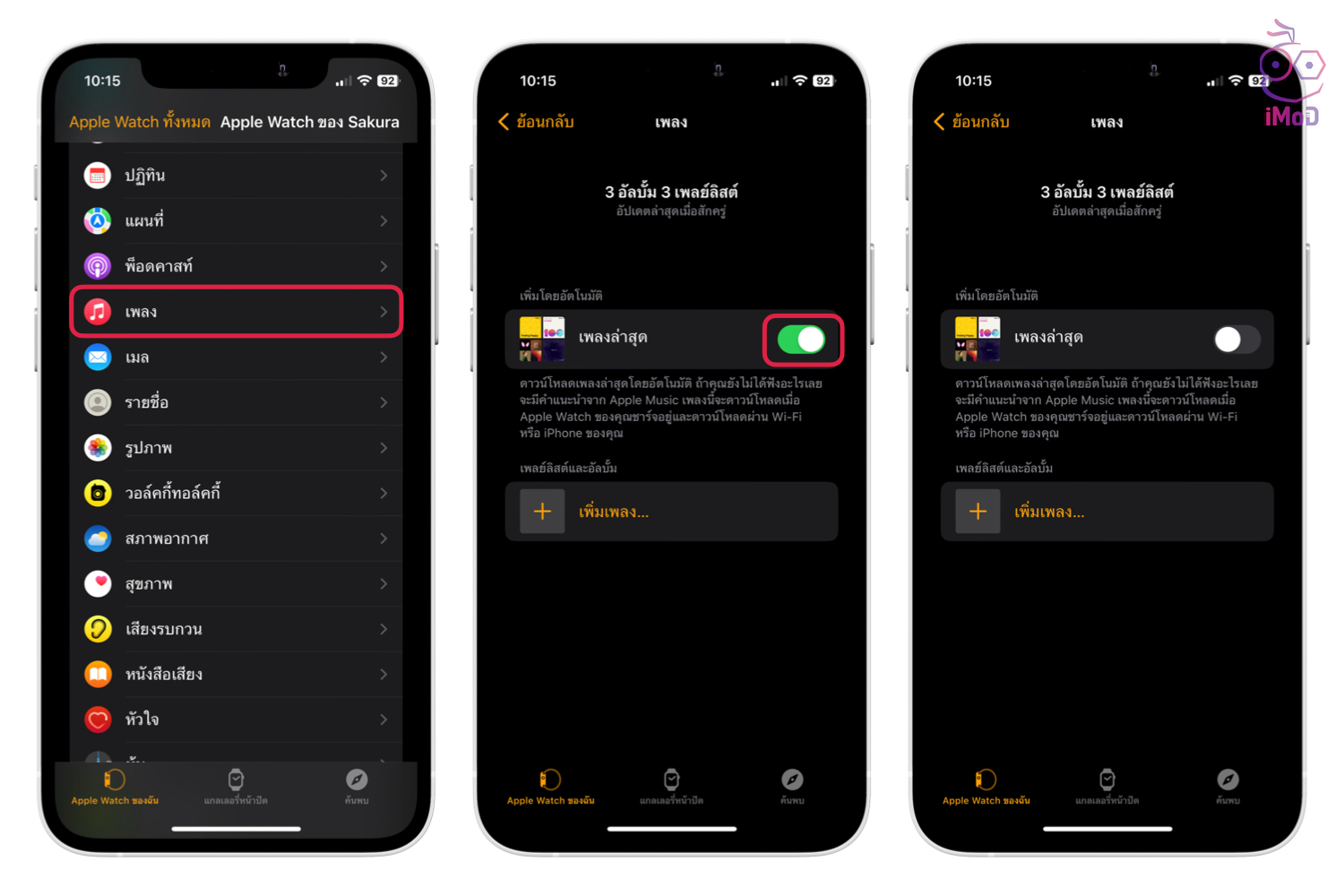 การซิงค์เพลย์ลิสต์เพลง Apple Music ก็คล้าย ๆ กับการซิงค์รูปภาพ ที่ใช้พื้นที่บน Apple Watch ในการจัดเก็บข้อมูลเช่นกัน ดังนั้น ถ้าหากเราไม่ได้ฟังเพลงบน Apple Watch ก็แนะนำให้ตั้งค่าปิดการซิงค์ได้ หรือจะเลือกซิงค์เฉพาะเพลย์ลิสต์ที่เราต้องการฟังจริง ๆ