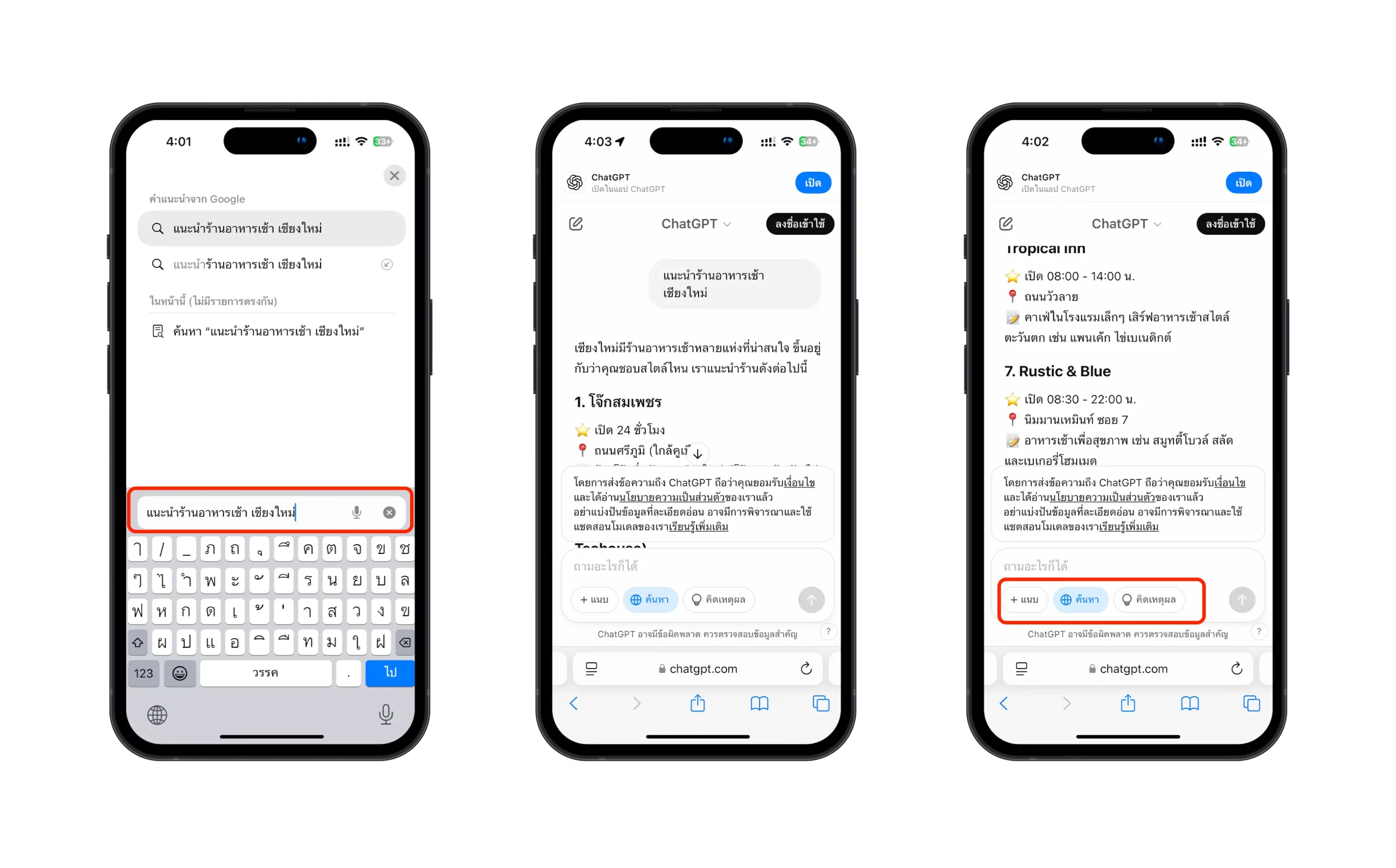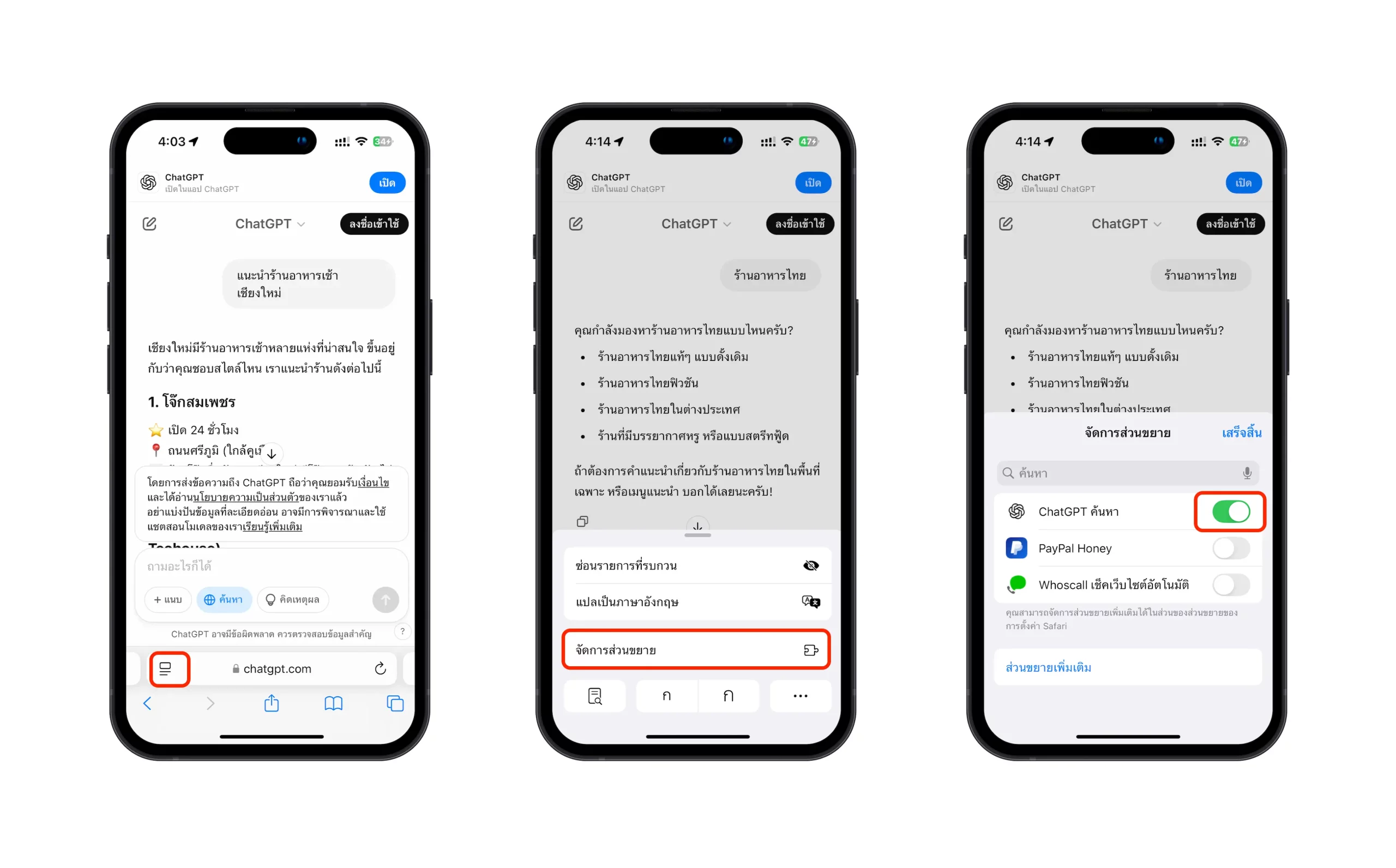 ไปที่แอป Safari > เลือกไอคอนด้านซ้ายของแถบค้นหา > จัดการส่วนขาย > เปิดใช้งาน ChatGPT ค้นหา