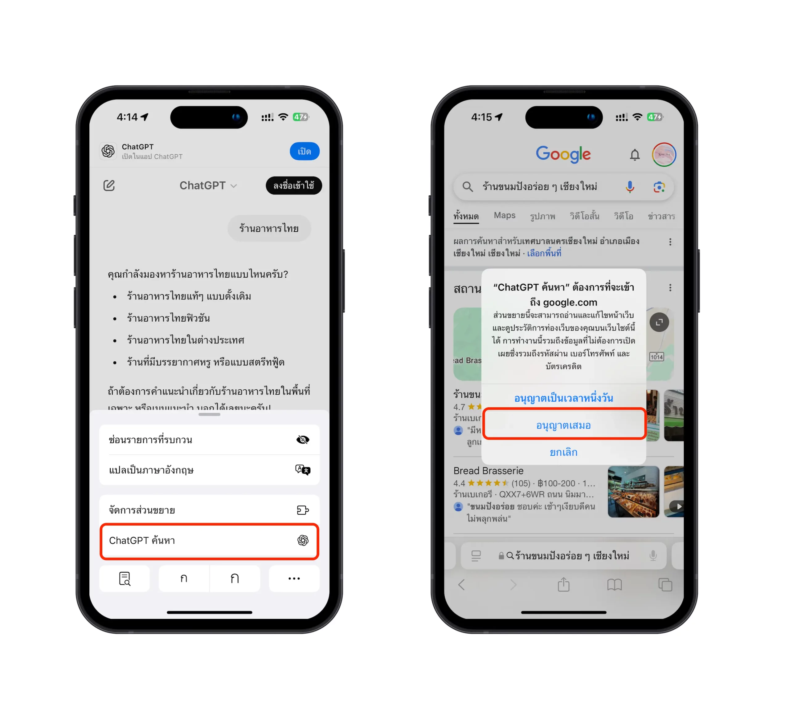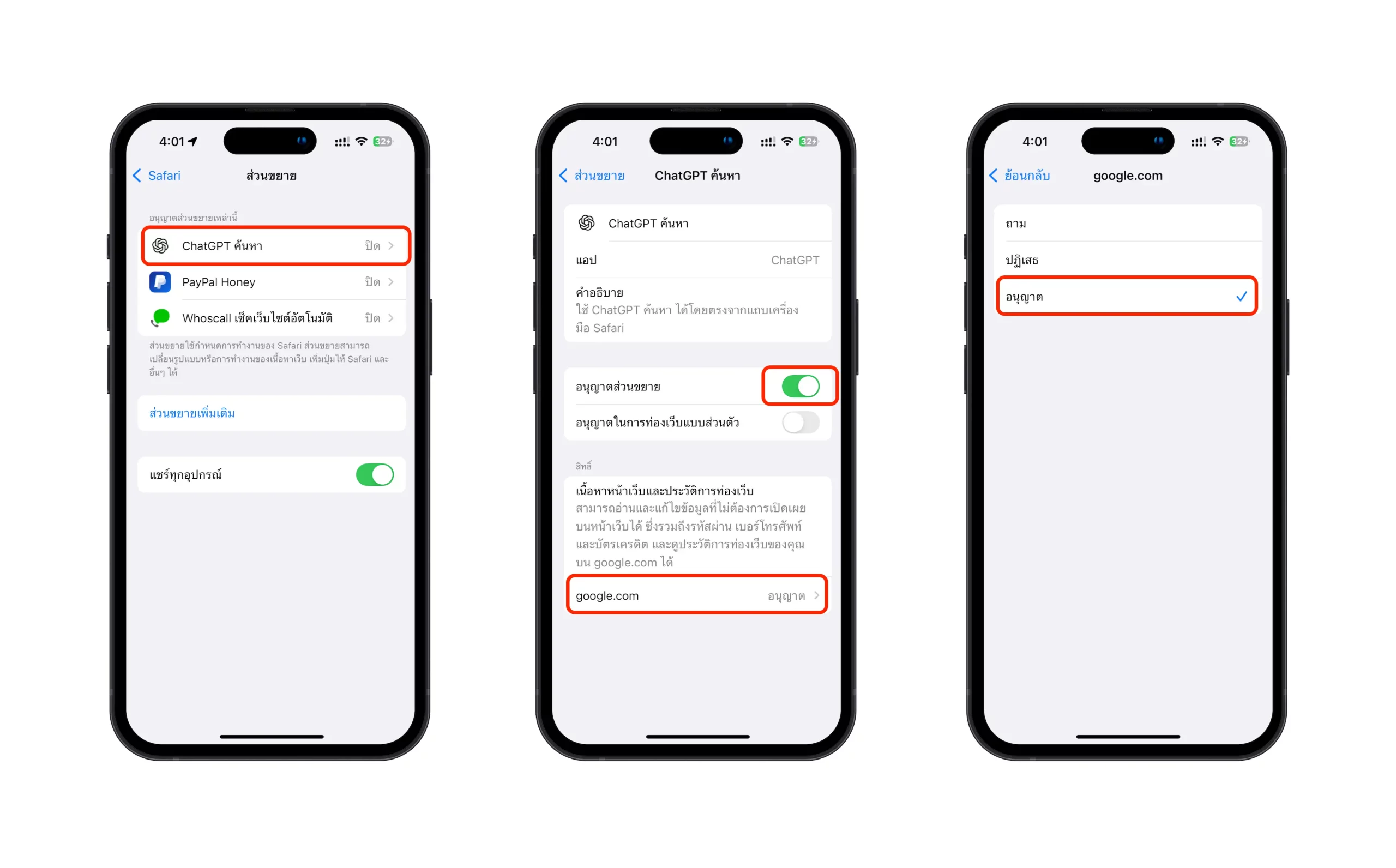 เลือก ChatGPT ค้นหา (Search ChatGPT) > เปิด อนุญาตส่วนขาย (Allow Extension) และแตะ google.com ด้านล่าง > เลือก อนุญาต (Allow)