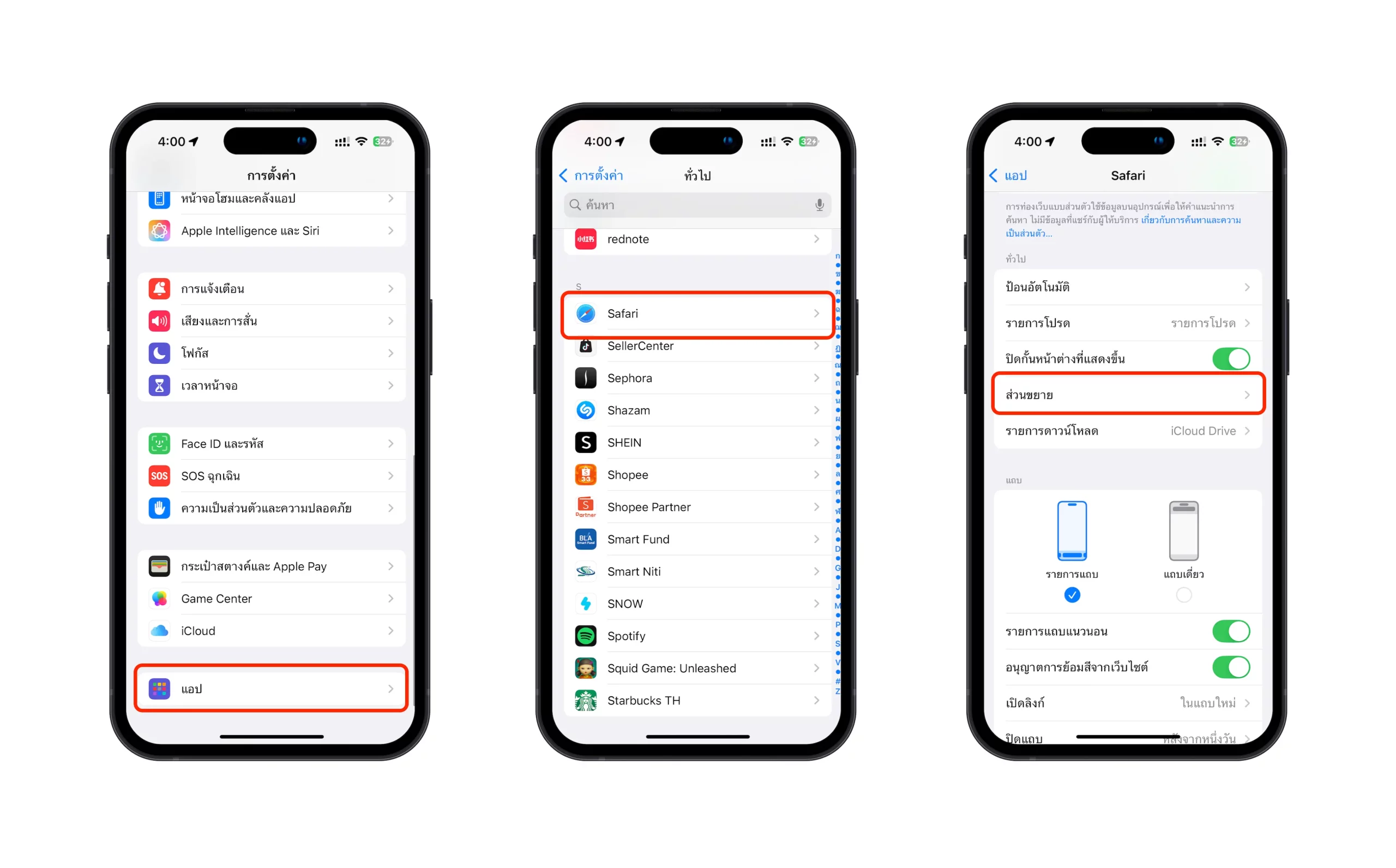 จากนั้นก็เริ่มตั้งค่ากันได้เลย โดย ไปที่ การตั้งค่า (Settings) > แอป (Apps) > เลือก Safari > ส่วนขยาย (Extensions)