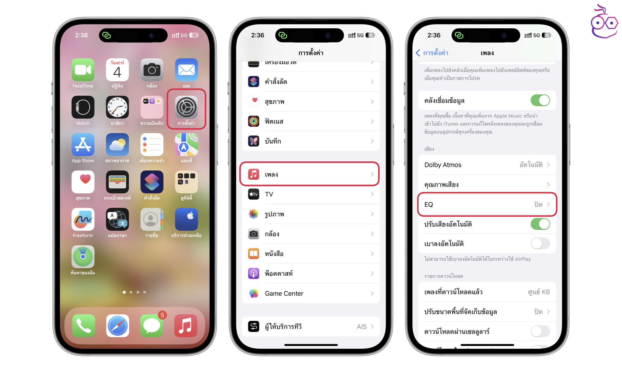 ไปที่ การตั้งค่า (Settings) > เพลง (Music) > EQ