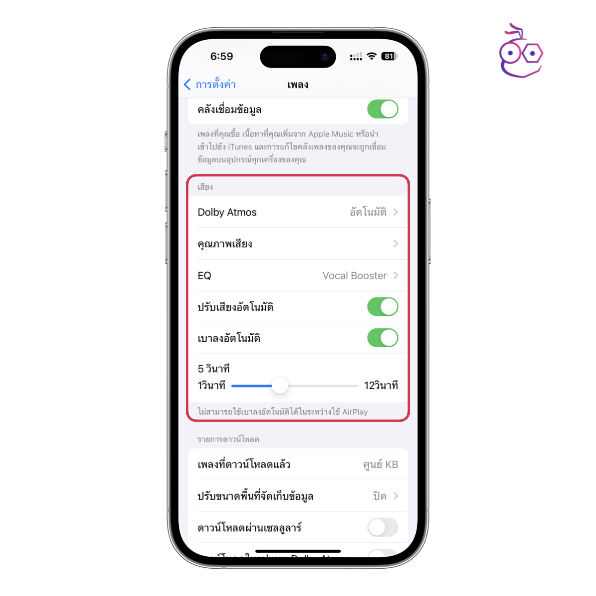 - เปิดการปรับเสียงอัตโนมัติ (Sound Check) ออกแบบมาเพื่อปรับเสียงของเพลงที่เล่นใน Apple Music ทั้งหมดให้มีระดับที่เท่ากัน การฟังเพลงก็จะราบรื่นมากขึ้น ไม่ต้องตกใจเวลาที่บางเพลงเสียงดัง