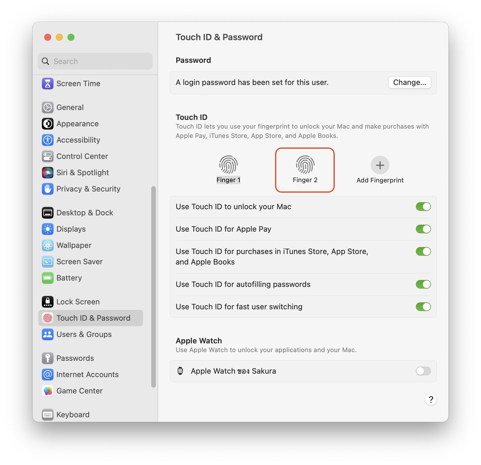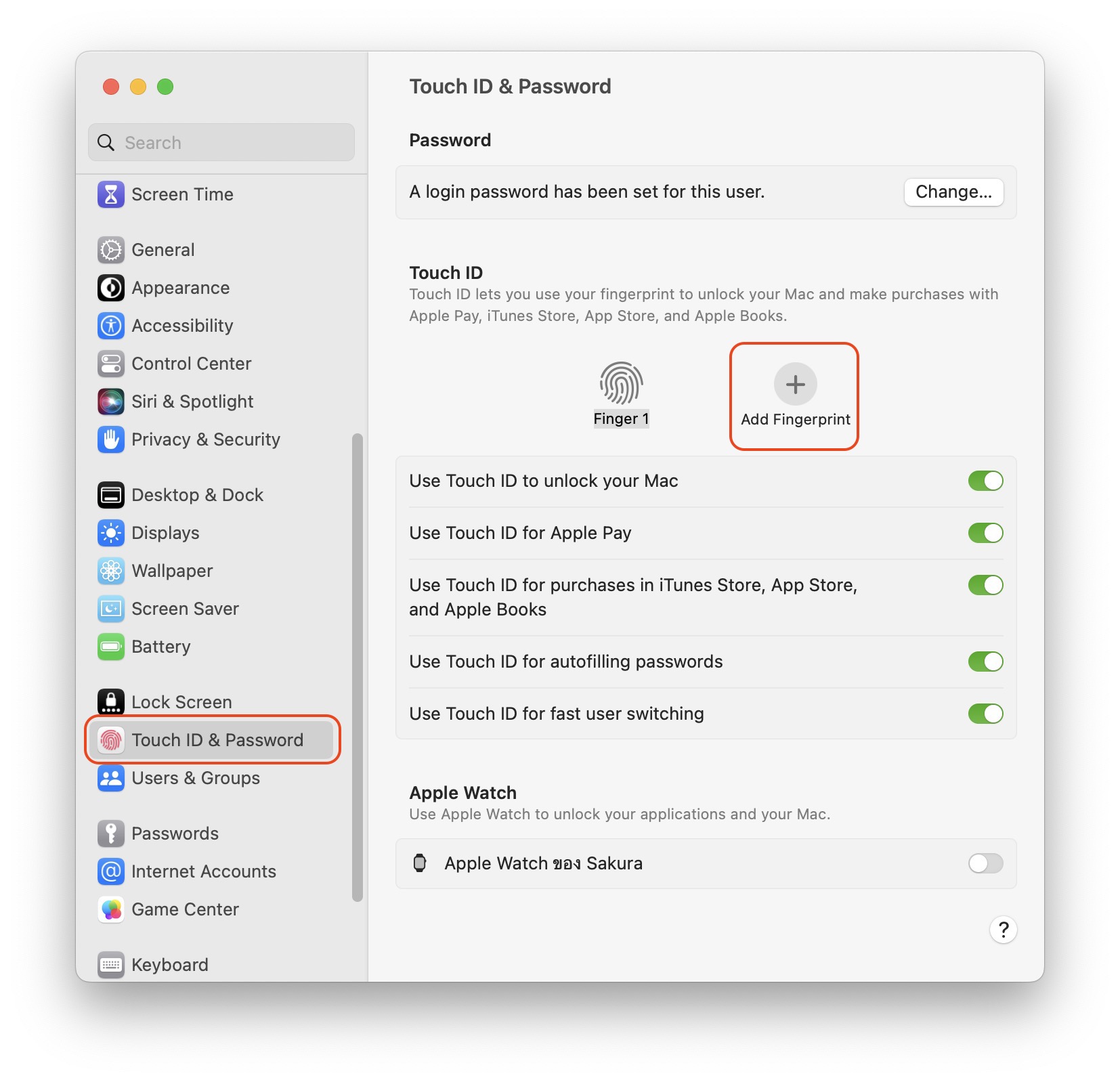 ไปที่ System Settings > Touch ID & Password > คลิกเลือก Add Fingerprint