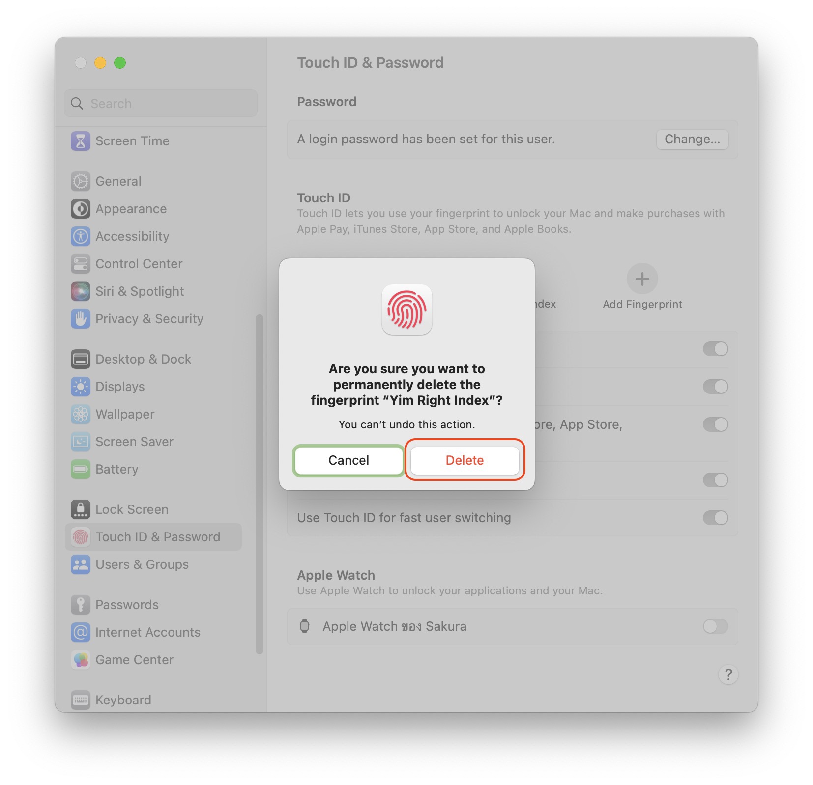 ไปที่ System Settings > Touch ID & Password > คลิกกากบาทที่ลายนิ้วมือ