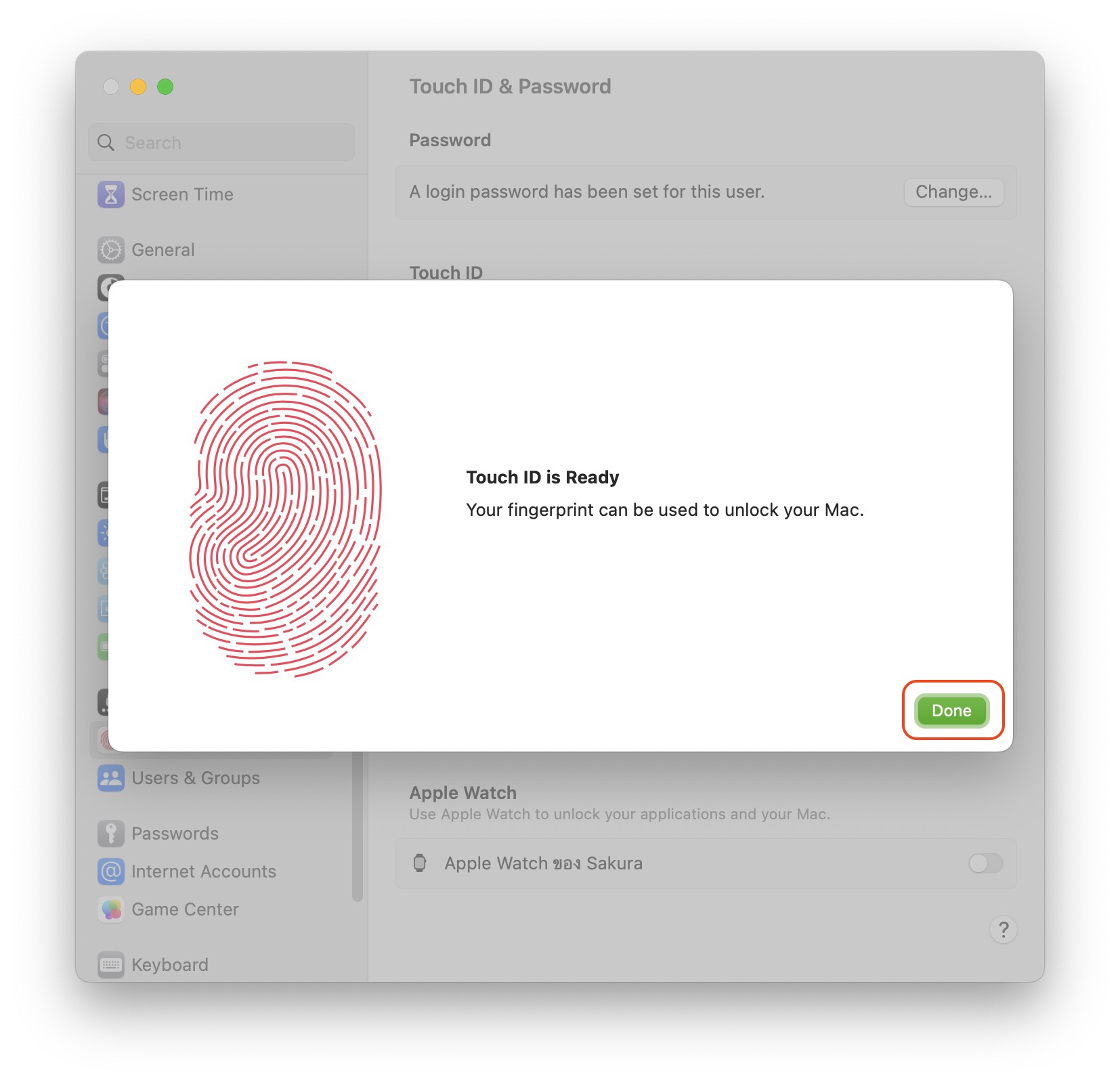 สแกนนิ้วมือที่ต้องการเพิ่มบนปุ่ม Touch ID ในคีย์บอร์ดให้ครบ แล้วคลิก Done
