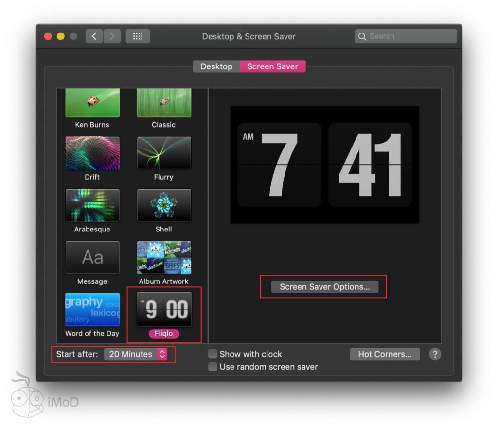 เลือก Screen Saver เป็น Fliqlo จากนั้นก็ตั้งค่า Screen Saver Options เพื่อเลือกรูปแบบเวลาเป็น 12 ชั่วโมงหรือ 24 ชั่วโมง และยังตั้งค่าเวลาที่จะเริ่ม Screen Saver ได้ในส่วน Start After ด้านล่าง หากต้องค่าเสร็จแล้วก็กากบาทหน้าจอออกได้เลย