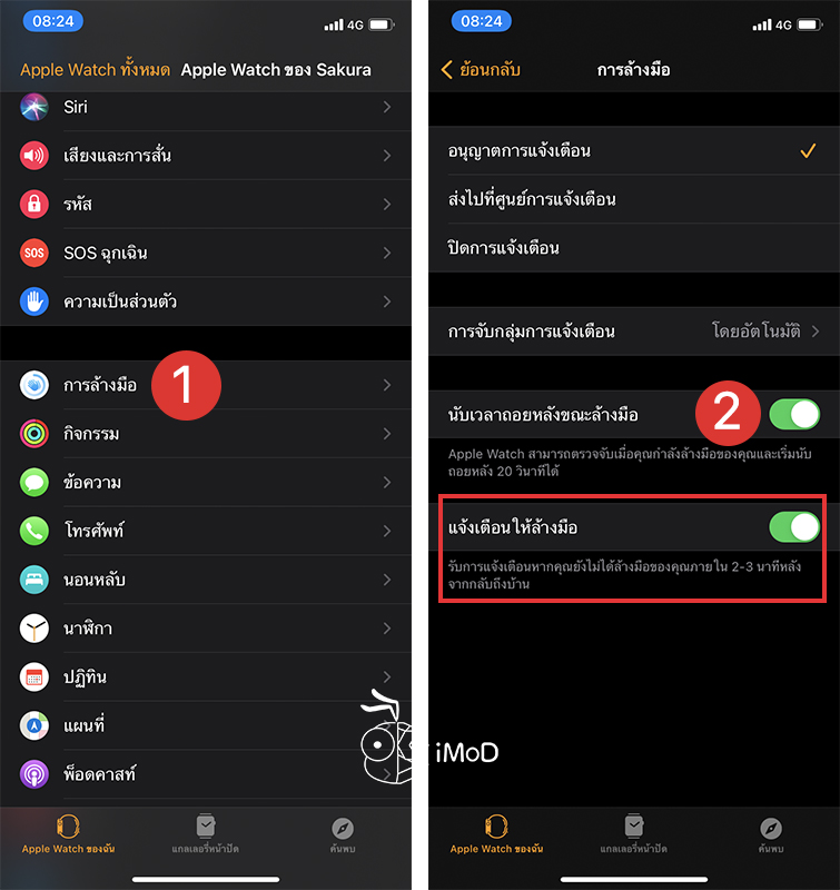 นอกจากนี้หากเราเป็นคนที่ชอบลืมล้างมือ เราก็สามารถตั้งค่าให้ Apple Watch แจ้งเตือนการล้างมือได้ โดย เปิด แจ้งเตือนให้ล้างมือ เพื่อรับการแจ้งเตือนหากเราไม่ได้ล้างมือภายใน 2-3 นาทีหลังจากที่เรากลับถึงบ้าน