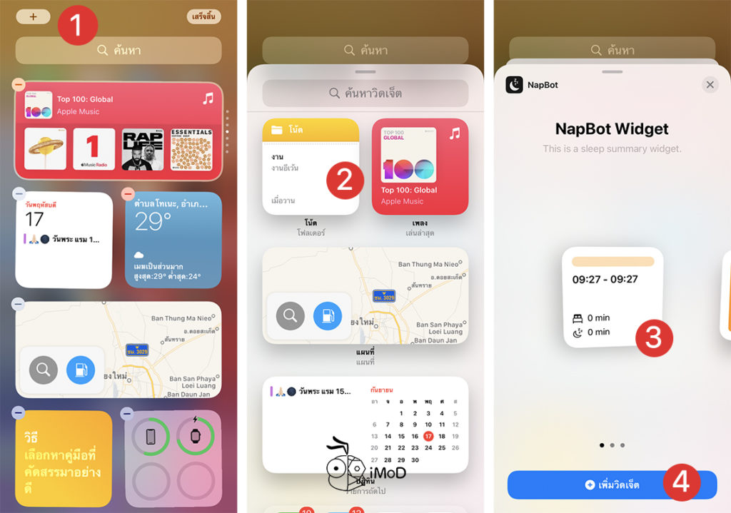 แตะหน้าโฮมค้างไว้ ให้ไอคอนแอปมีไอคอนลบ > แตะไอคอนบวกด้านมุมบนขวา > แตะเลือกวิดเจ็ตที่ต้องการ > ปัดเลื่อนรูปแบบวิดเจ็ต > แตะเพิ่มวิดเจ็ต
