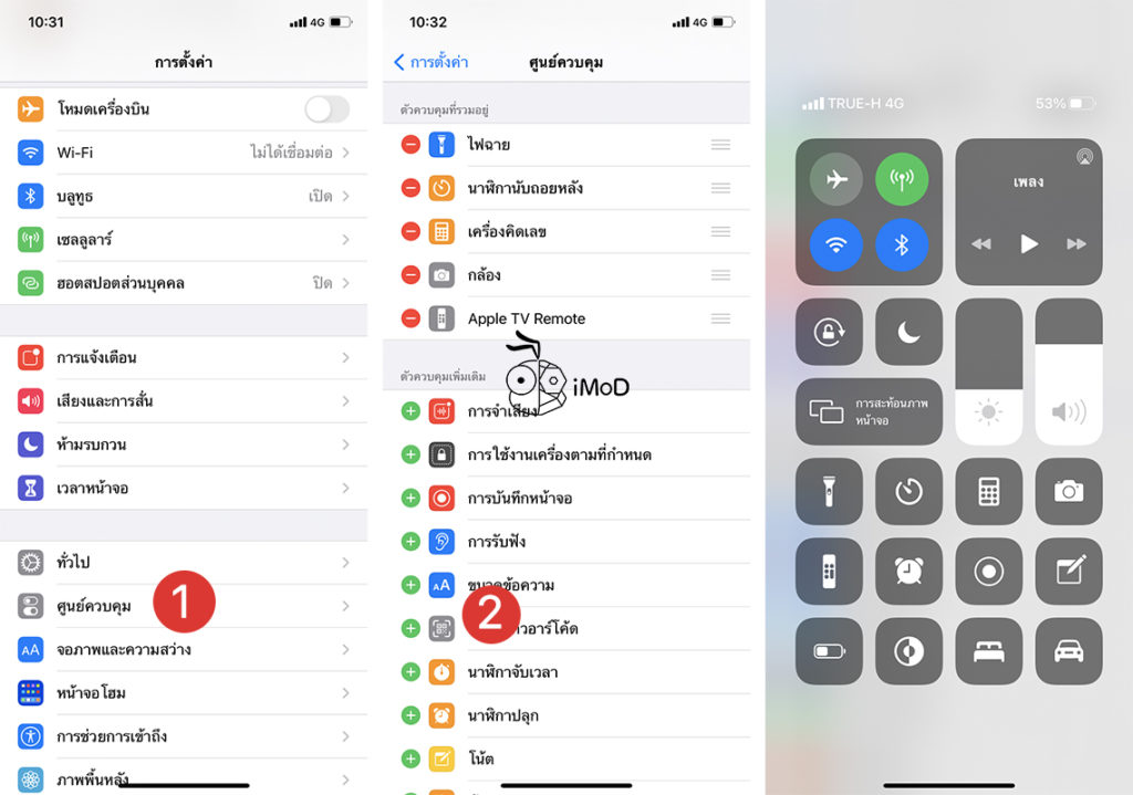 ไปที่ การตั้งค่า (Settings) > แตะ ศูนย์ควบคุม (Control Center) > แตะ กำหนดแถบควบคุมเอง (Customize Controls) > เลือกเครื่องมือที่ต้องการโดยเลือกไอคอน + และลบเครื่องมือที่ไม่ต้องการให้แสดงใน Control Center โดยแตะที่ไอคอน –