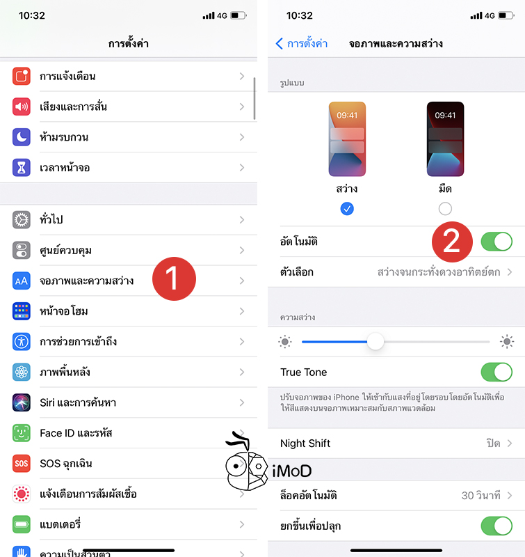 ไปที่การตั้งค่า (Settings) > จอภาพและความสว่าง (Display & Brightness) > แตะเลือก มืด (Dark) ถ้าต้องการให้มีการเปิดปิดโหมดมืดแบบอัตโนมัติก็สามารถแตะเลือกเปิด อัตโนมัติ ได้เลย จากนั้นก็ตั้งเวลาหรือจะเลือกการเปิดโหมดมืดจนถึงดวอาทิตย์ขึ้นก็ได้