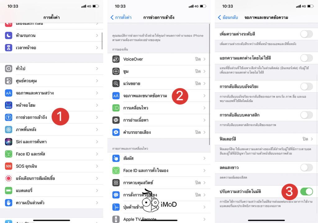 ไปที่การตั้งค่า (Settings) > จอภาพและขนาดข้อความ > เปิด ปรับความสว่างอัตโนมัติ (Auto Brightness)