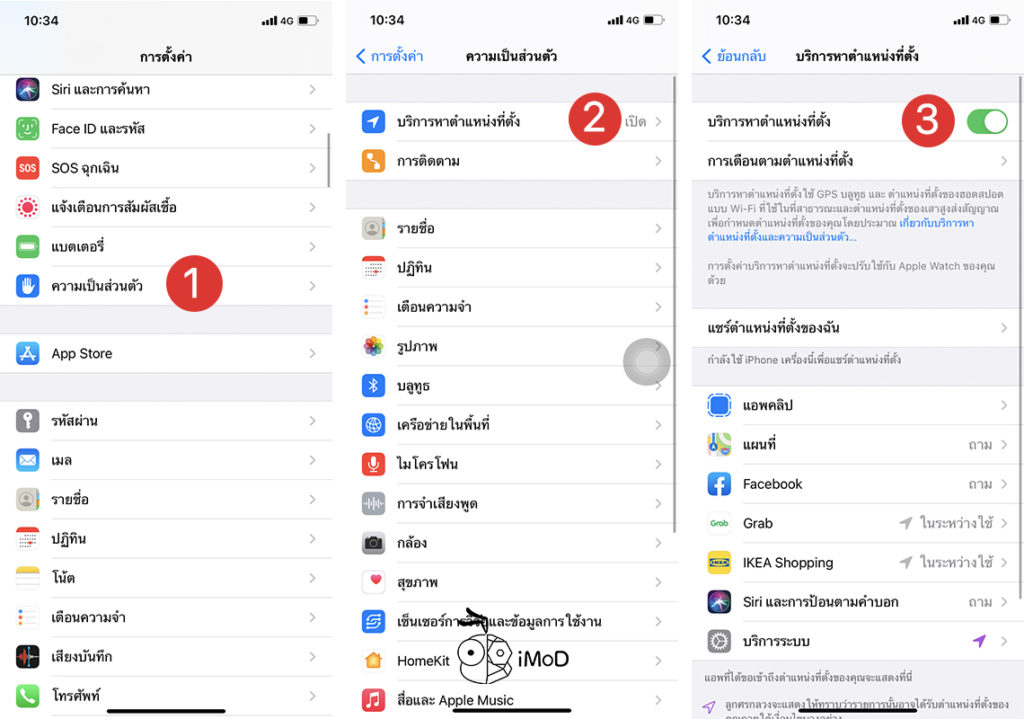 ไปที่การตั้งค่า (Settings) > ความเป็นส่วนตัว (Privacy) > บริการหาตำแหน่งที่ตั้ง (Location Services) > เปิด บริการหาตำแหน่งที่ตั้ง (Location Services) หากต้องการอนุญาตบางแอปให้เลือกเปิดตามแอปด้านล่าง