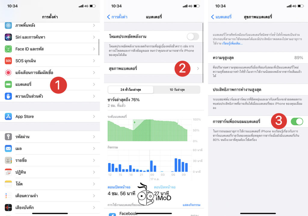 ไปที่ การตั้งค่า (Settings) > แบตเตอรี่ (Battery) > สุขภาพแบตเตอรี่ (Battery Health) > เปิด การชาร์จเพื่อถนอมแบตเตอรี่