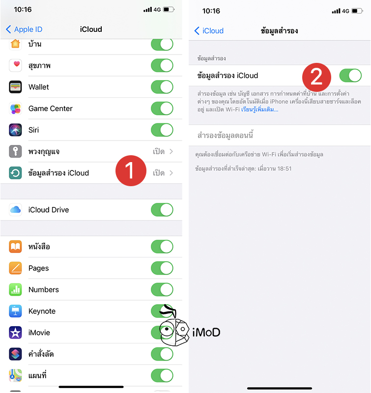 ไปที่ ข้อมูลสำรอง iCloud (iCloud Backup) > เปิด ข้อมูลสำรอง iCloud (iCloud Backup)