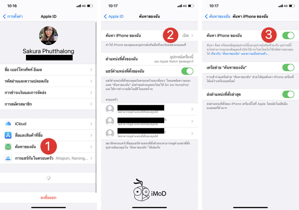 ไปที่การตั้งค่า (Settings) > Apple ID > ค้นหาของฉัน (Find My) > เปิด ค้นหา iPhone ของฉัน (Find My iPhone)