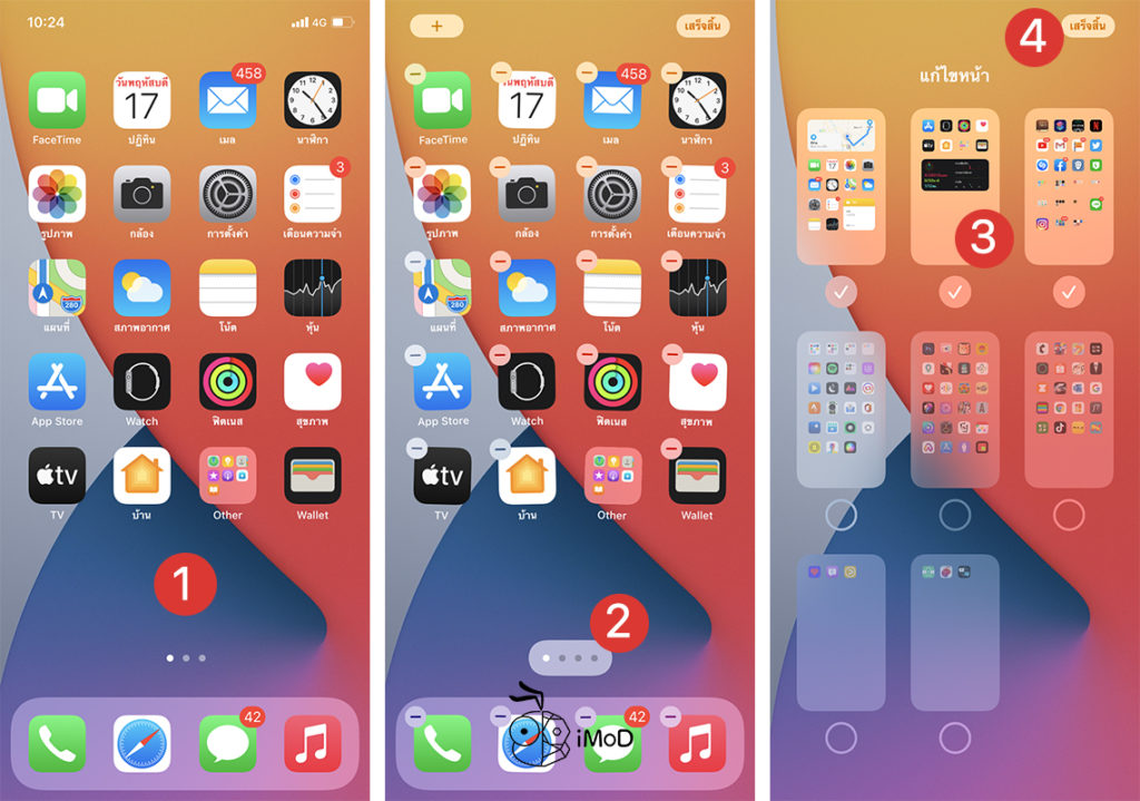 แตะหน้าโฮมค้างไว้ ให้แอปแสดงไอคอนลบ > แตะไอคอนจุดด้านล่าง > เลือกหน้าโฮมที่ต้องการให้แสดง แล้วแตะเสร็จสิ้น (Done)