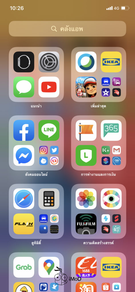 หากเราเลือกหน้าโฮมไม่ให้แสดงทั้งหมด เราสามารถเข้าถึงแอปอื่น ๆ ได้ในส่วนของคลังแอป โดยเลื่อนหน้าไปหน้าสุดท้าย เราก็จะแสดงคลังแอปที่มีการจัดหมวดหมู่เรียบร้อยแล้ว