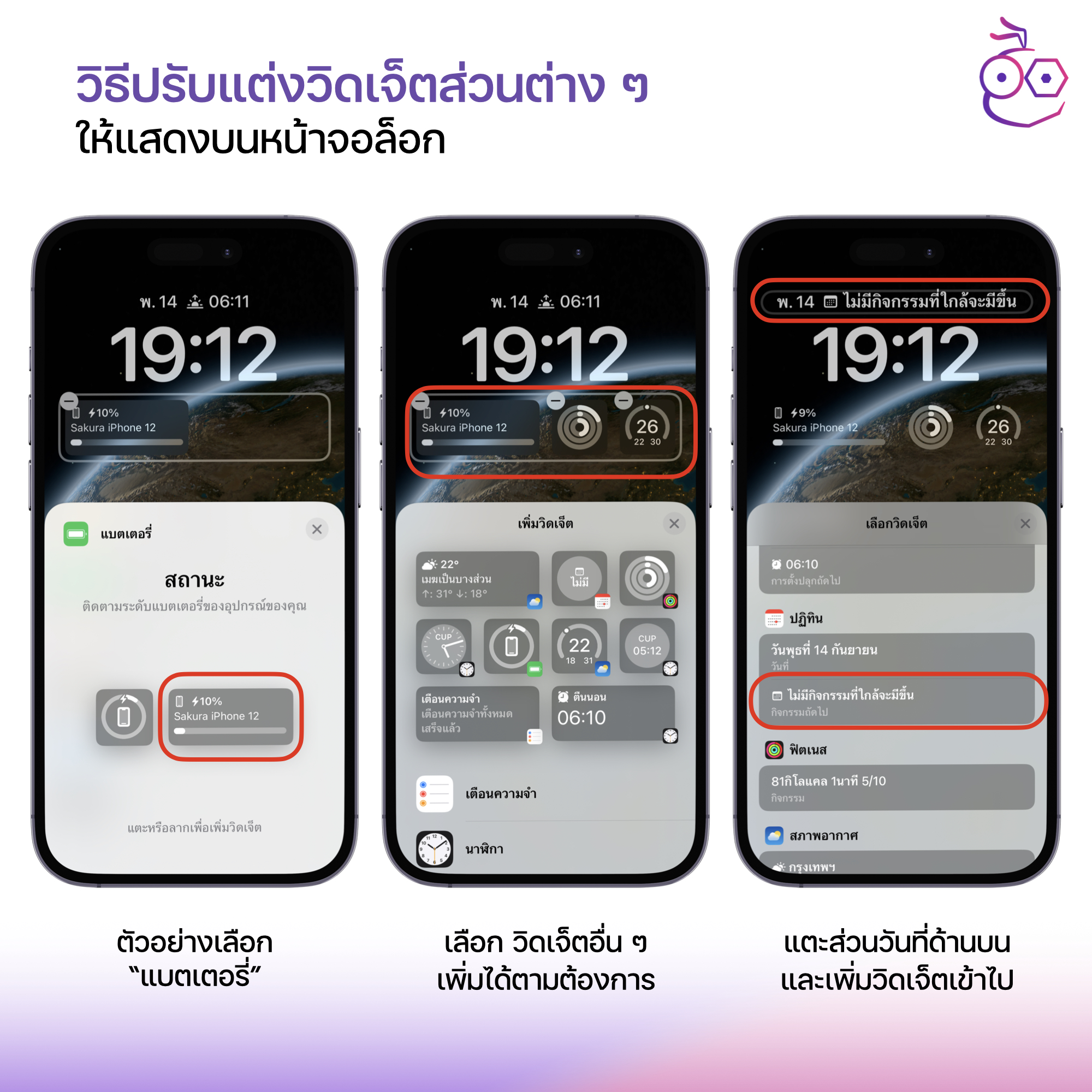 แตะเลือกหน้าจอล็อกที่ต้องการ > แตะ เพิ่มวิดเจ็ต > เลือกวิดเจ็ตได้เลย
