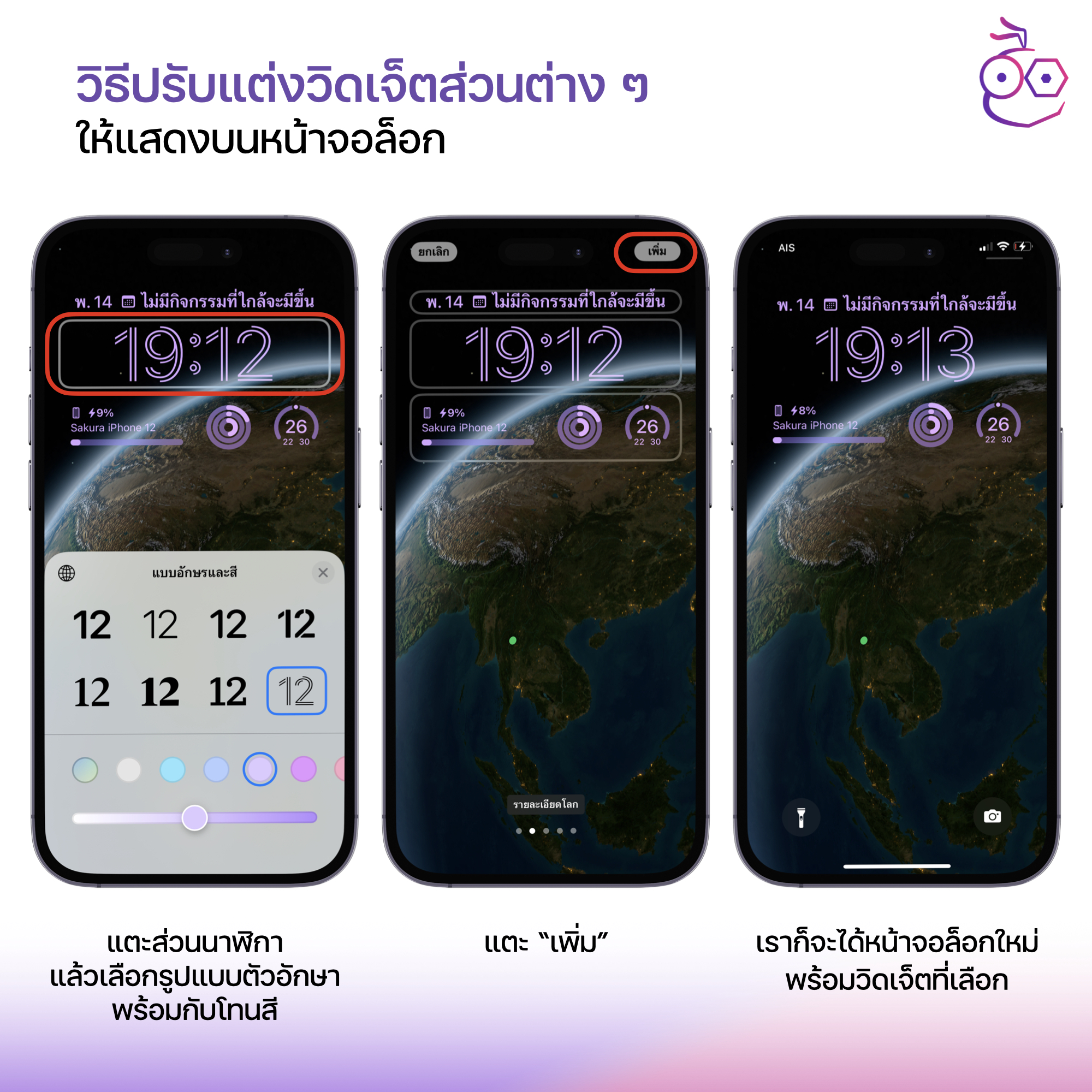 ส่วนของนาฬิกาก็สามารถปรับแต่งรูปแบบตัวอักษร และเลือกสีได้ตามต้องการ เมื่อปรับแต่งเสร็จแล้วให้แตะ เพิ่ม > เราก็จะได้หน้าจอล็อกพร้อมวิดเจ็ตที่เรากำหนด