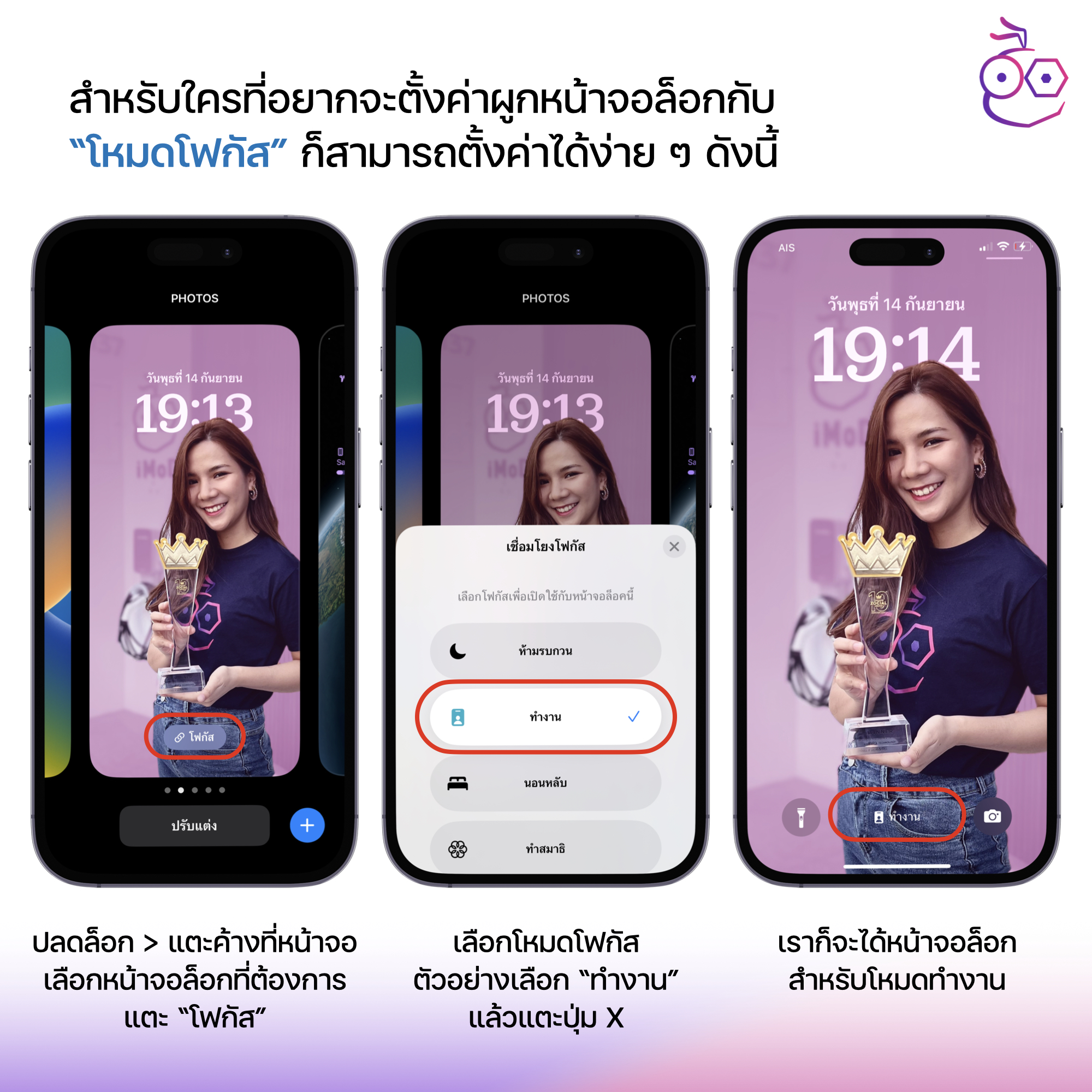 ปลดล็อกหน้าจอ แล้วแตะค้างไว้ จนมีตัวเลือกหน้าจอล็อกแสดงขึ้นมา > ไปยังหน้าจอล็อกที่ต้องการ แล้วแตะเลือก โฟกัส > เลือกโหมดโฟกัสที่ต้องการ เช่น โหมดทำงาน > เมื่อเลือกเสร็จแล้ว ถ้าเราเปิดโหมดโฟกัสทำงาน หน้าจอล็อกก็จะแสดงเป็นหน้าที่เชื่อมโยงไว้