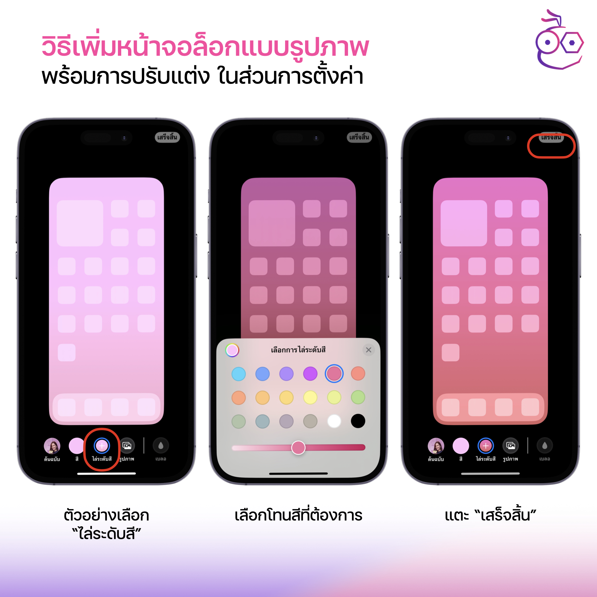 ตัวอย่างเลือกเป็นไล่ระดับสี > เลือกสีและปรับโทนได้ตามต้องการ > แตะ เสร็จสิ้น