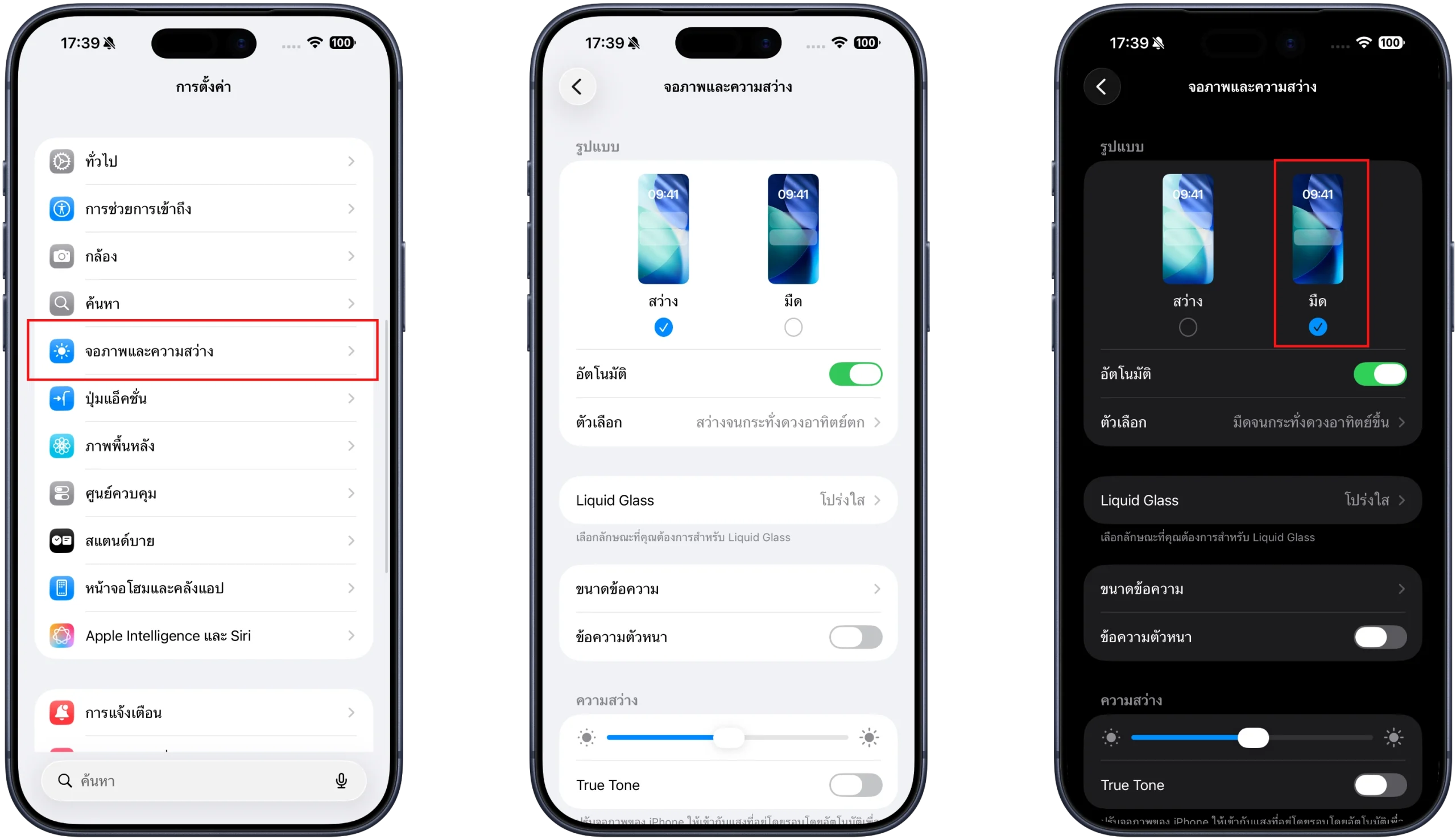 ไปที่การตั้งค่า > จอภาพและความสว่าง > แตะ มืด