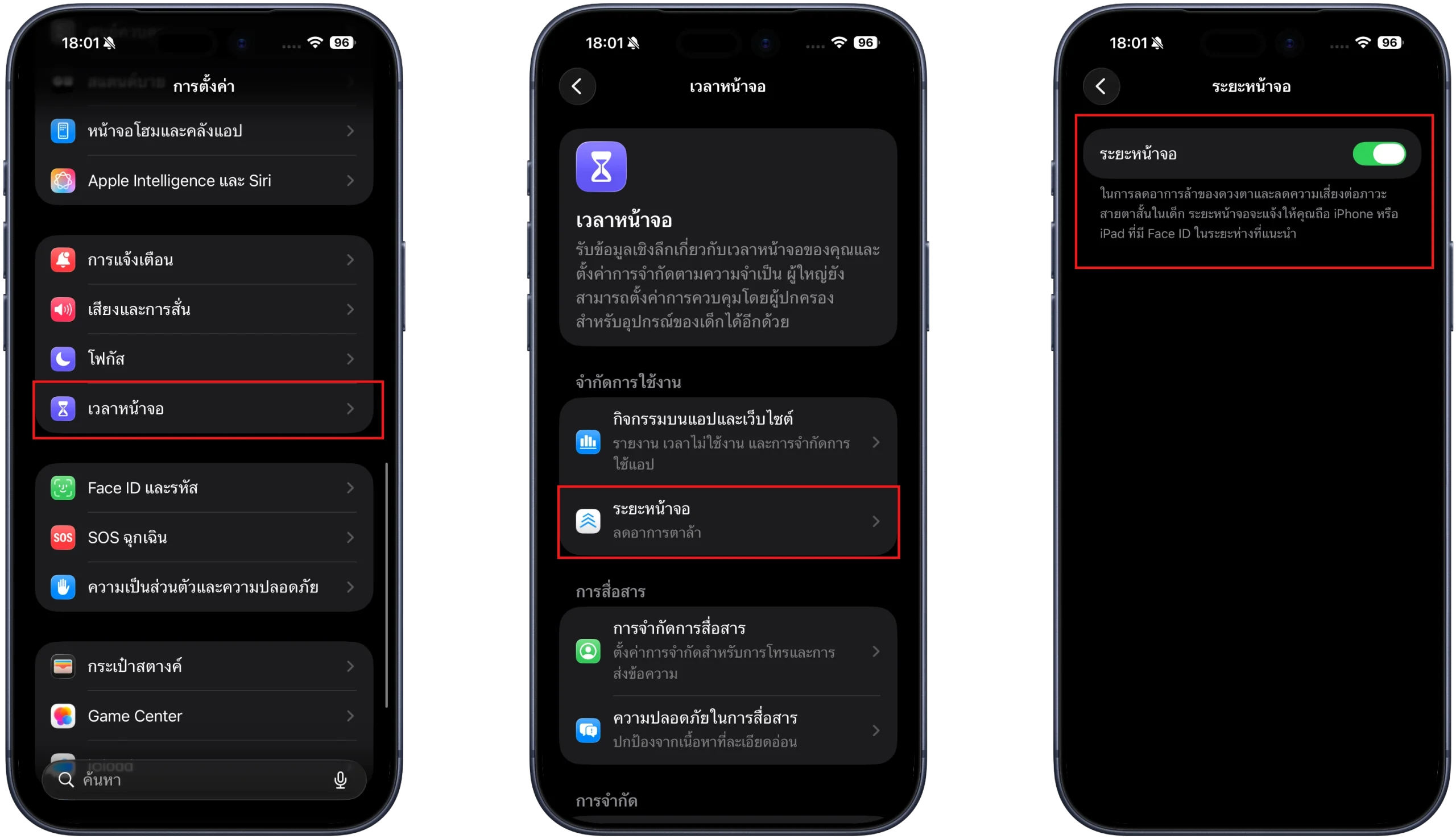 ไปที่การตั้งค่า > เวลาหน้าจอ > ระยะหน้าจอ > เลื่อนเปิด ระยะหน้าจอ