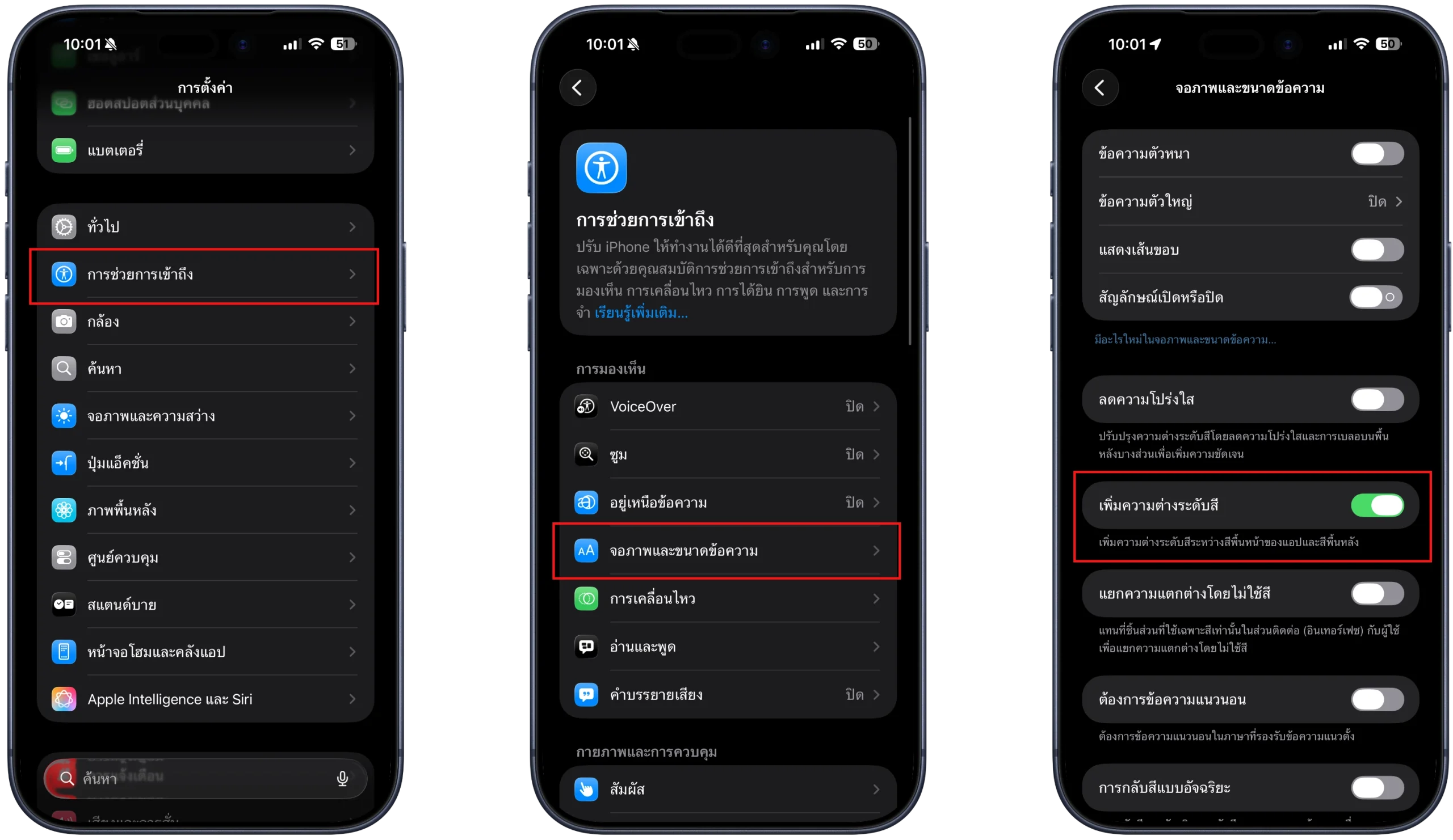 ไปที่การตั้งค่า > การช่วยการเข้าถึง > จอภาพและขนาดข้อความ > เลื่อนเปิด ความต่างระดับสี