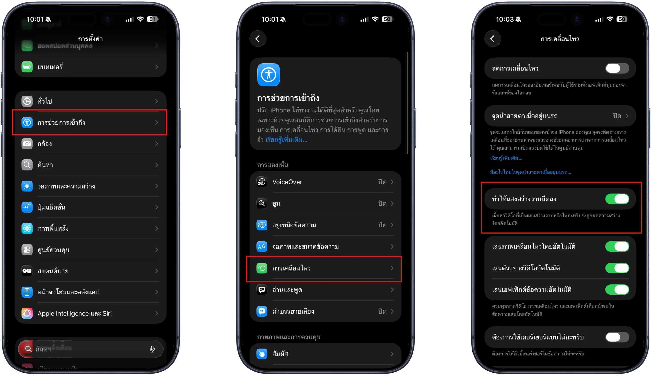 ไปที่การตั้งค่า > การช่วยการเข้าถึง > การเคลื่อนไหว > เลื่อนเปิด ทำให้แสงสว่างวาบมืดลง