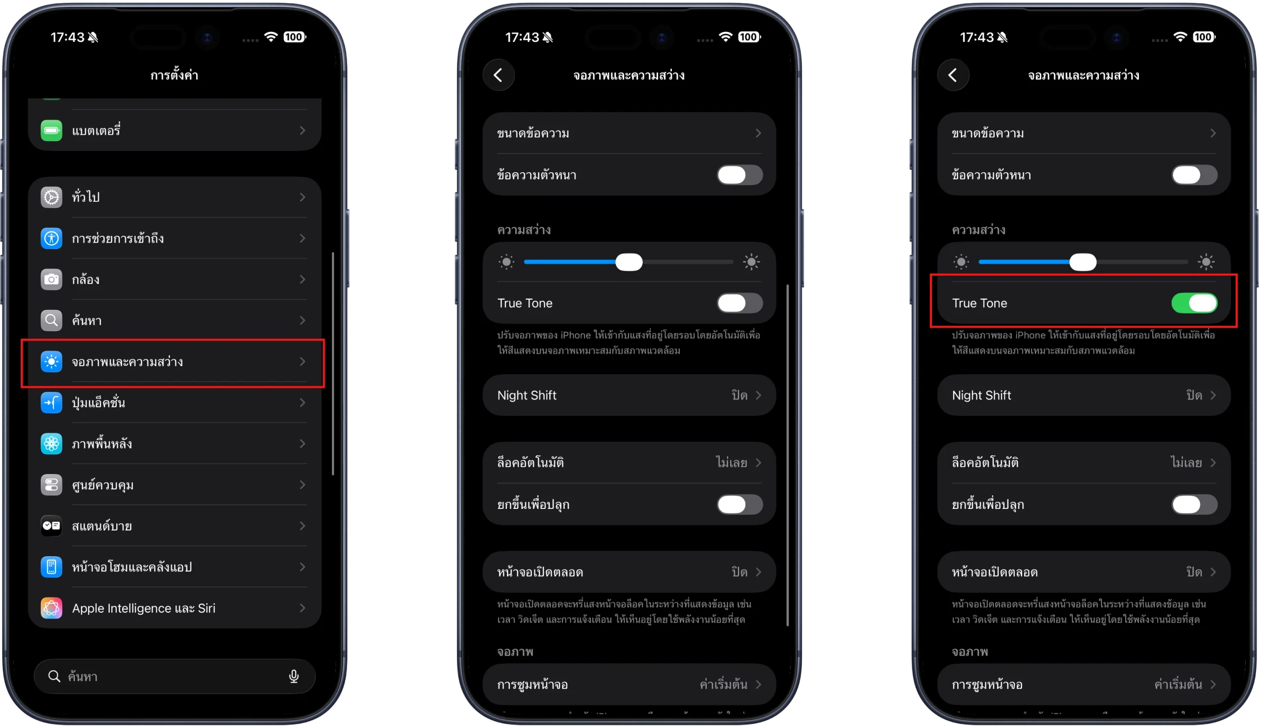 ไปที่การตั้งค่า > จอภาพและความสว่าง > เลื่อนเปิด True Tone