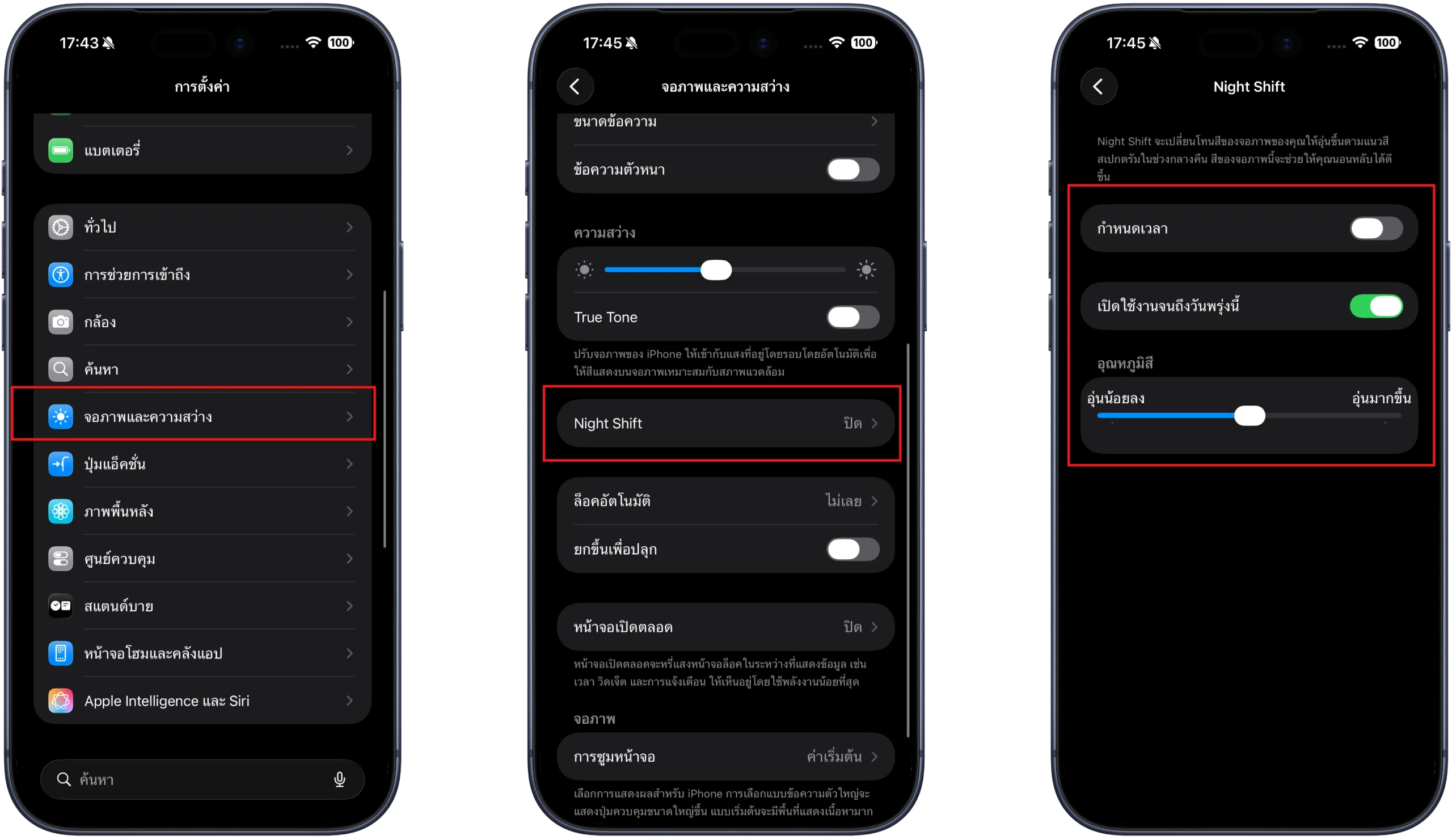ไปที่การตั้งค่า > จอภาพและความสว่าง > Night Shift > จากนั้นตั้งค่าตามต้องการว่าจะให้เปิด Night Shift ตอนไหน