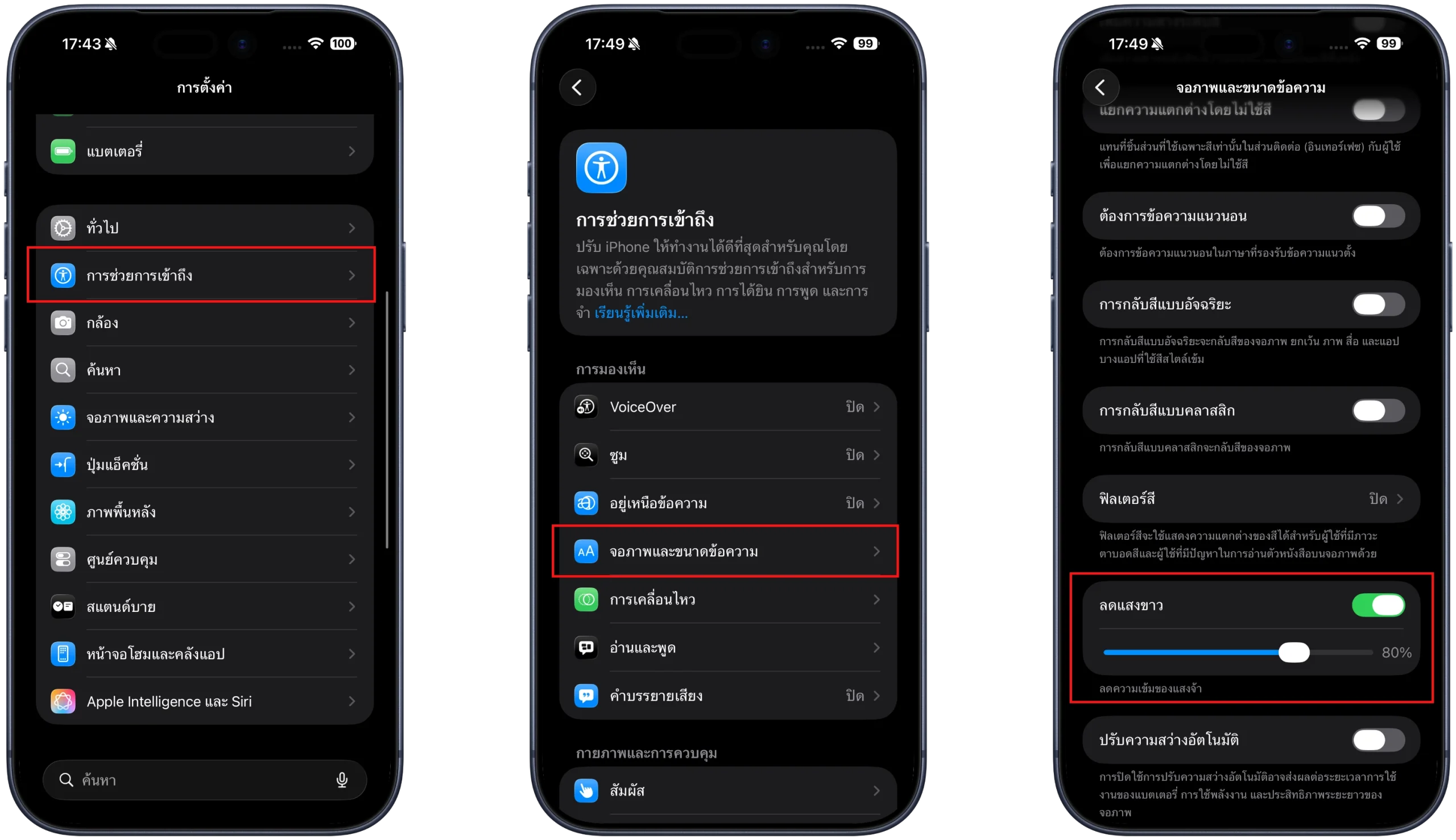 ไปที่การตั้งค่า > การช่วยการเข้าถึง > จอภาพและขนาดข้อความ > เลื่อนเปิด ลดแสงขาว