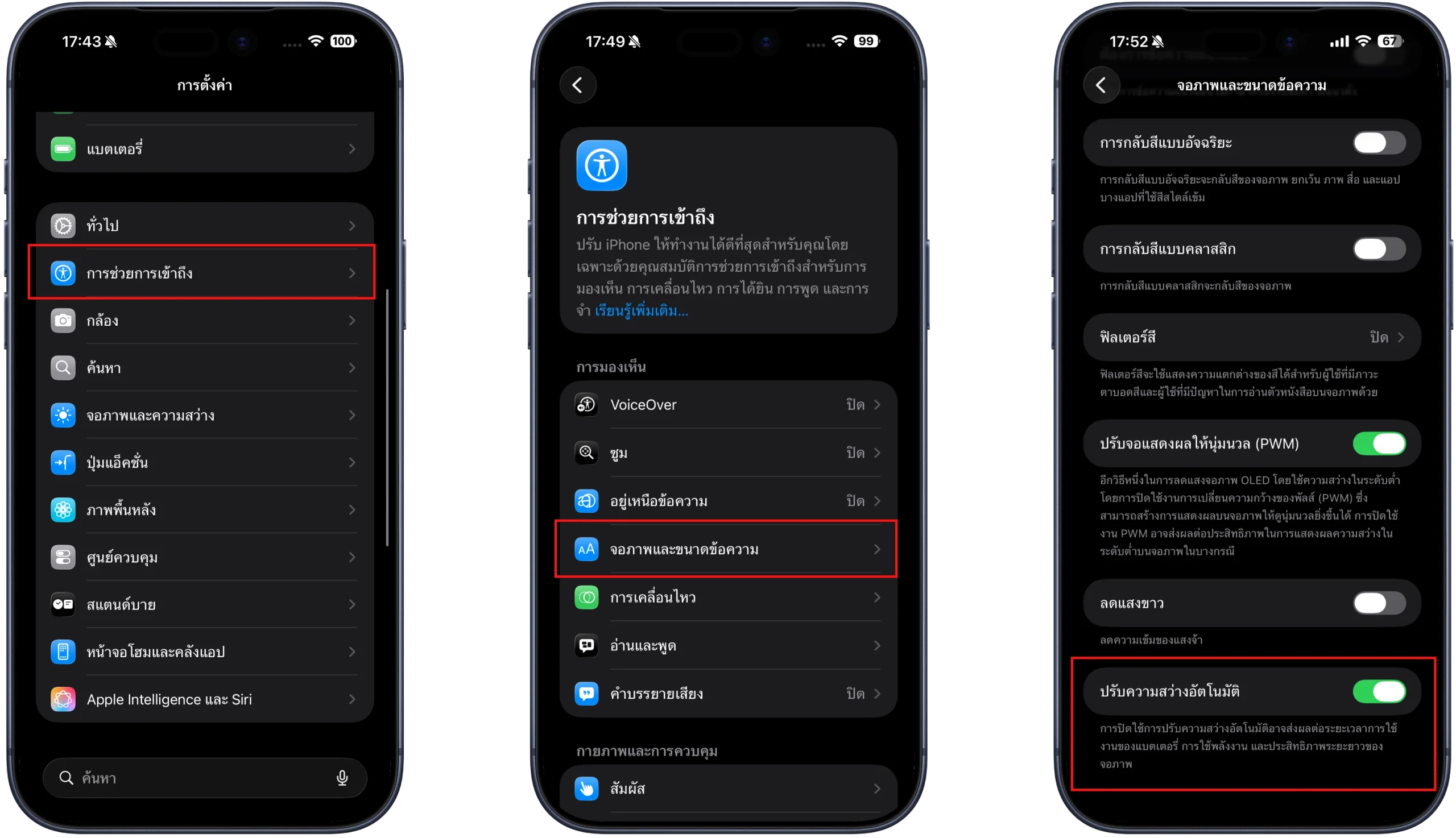 ไปที่การตั้งค่า > การช่วยการเข้าถึง > จอภาพและขนาดข้อความ > เลื่อนเปิด ปรับความสว่างอัตโนมัติ
