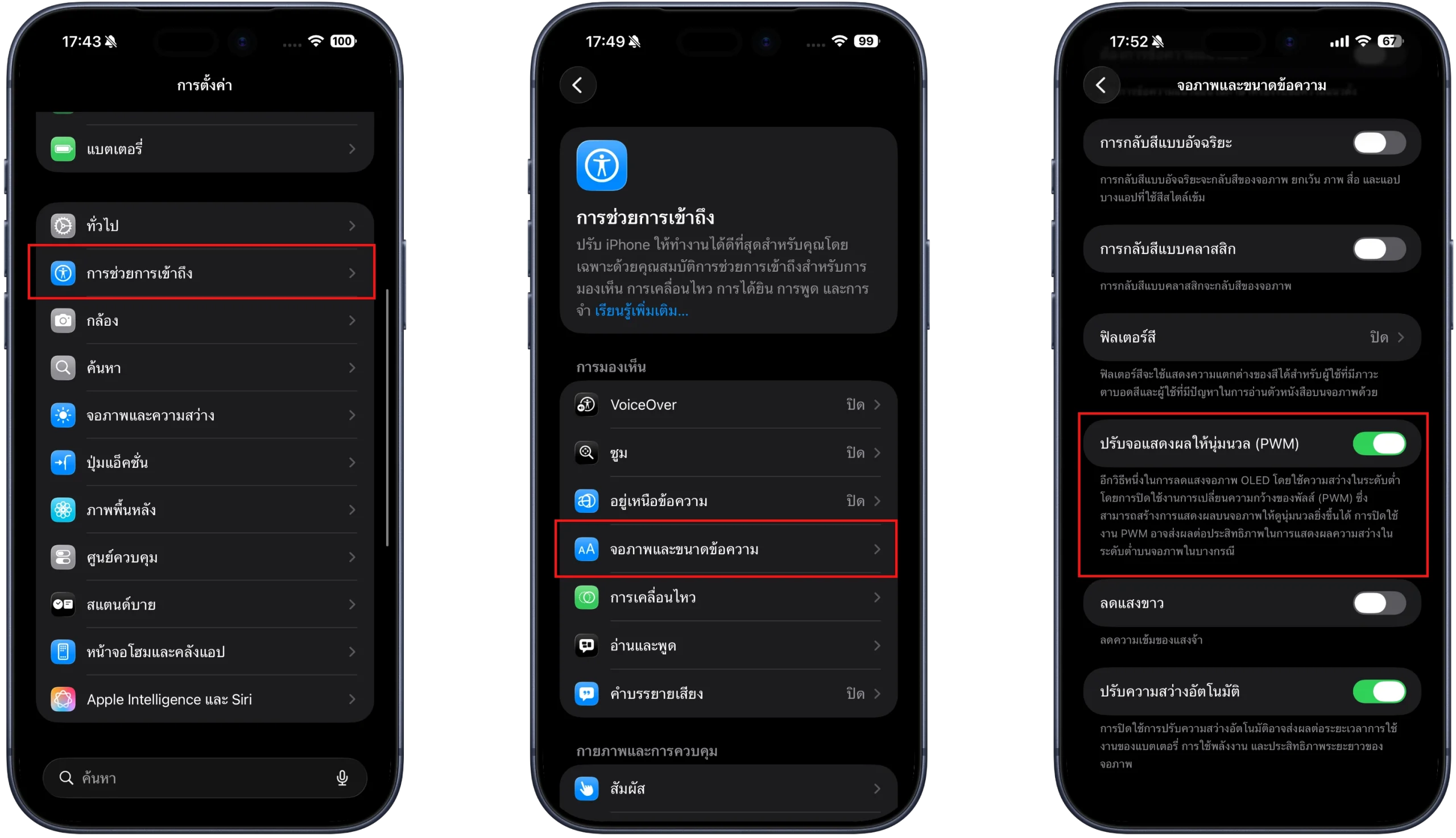 ไปที่การตั้งค่า > การช่วยการเข้าถึง > จอภาพและขนาดข้อความ > เลื่อนเปิด ปรับจอแสดงผลให้นุ่มนวล (PWM)