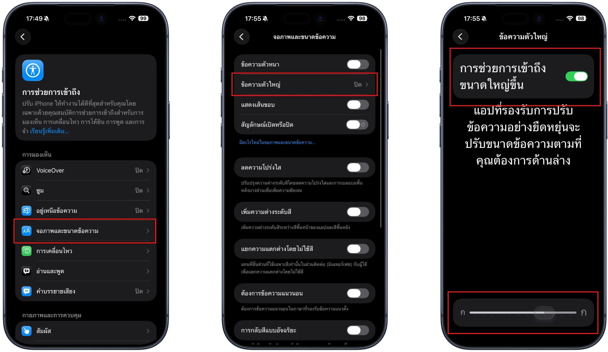 ไปที่การตั้งค่า > การช่วยการเข้าถึง > จอภาพและขนาดข้อความ > ข้อความตัวใหญ่ > เลื่อนเปิด การช่วยการเข้าถึงขนาดใหญ่ขึ้น