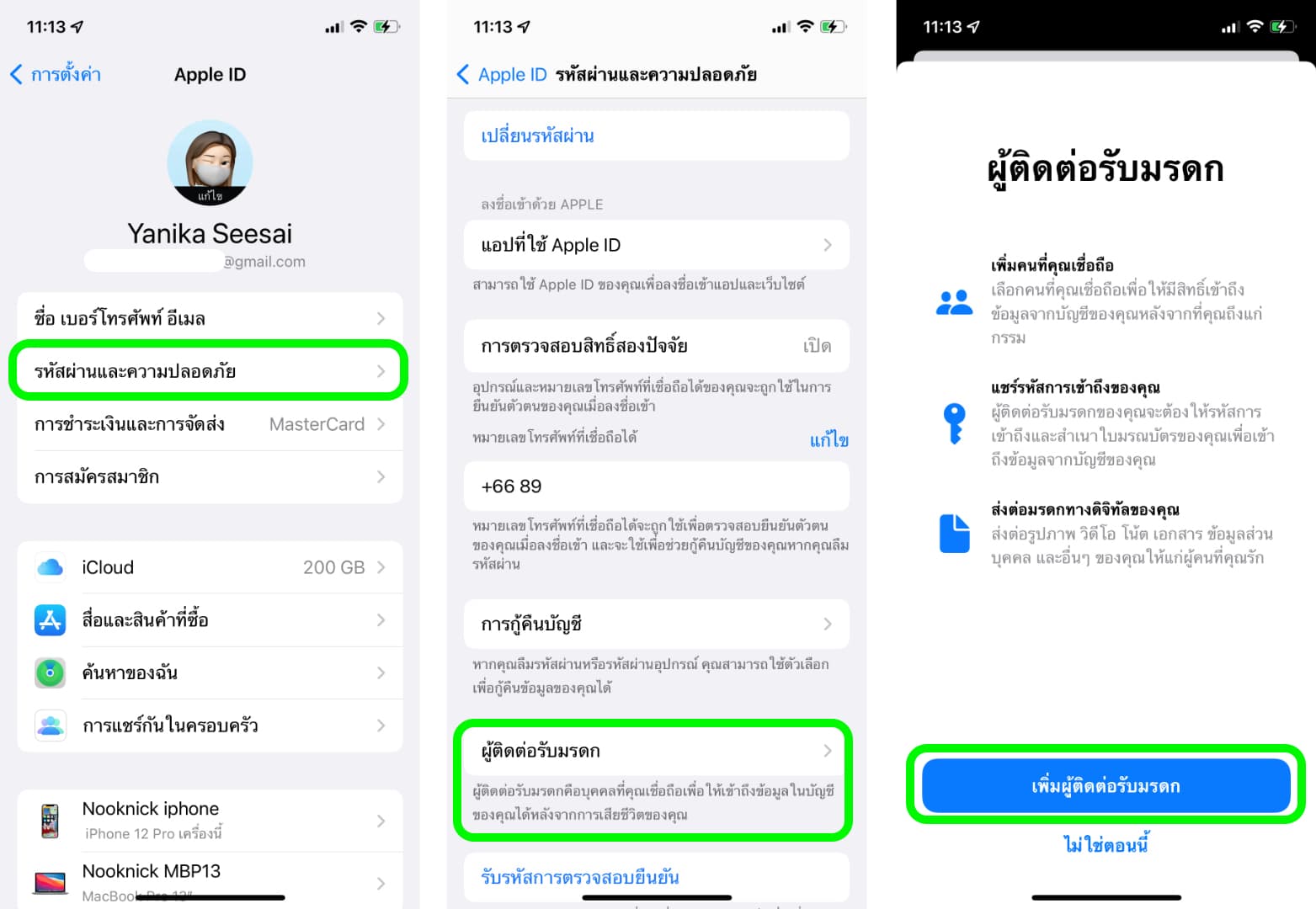 การตั้งค่า > Apple ID > รหัสผ่านและความปลอดภัย > ผู้ติดต่อรับมรดก > แตะ เพิ่มผู้ติดต่อรับมรดก
