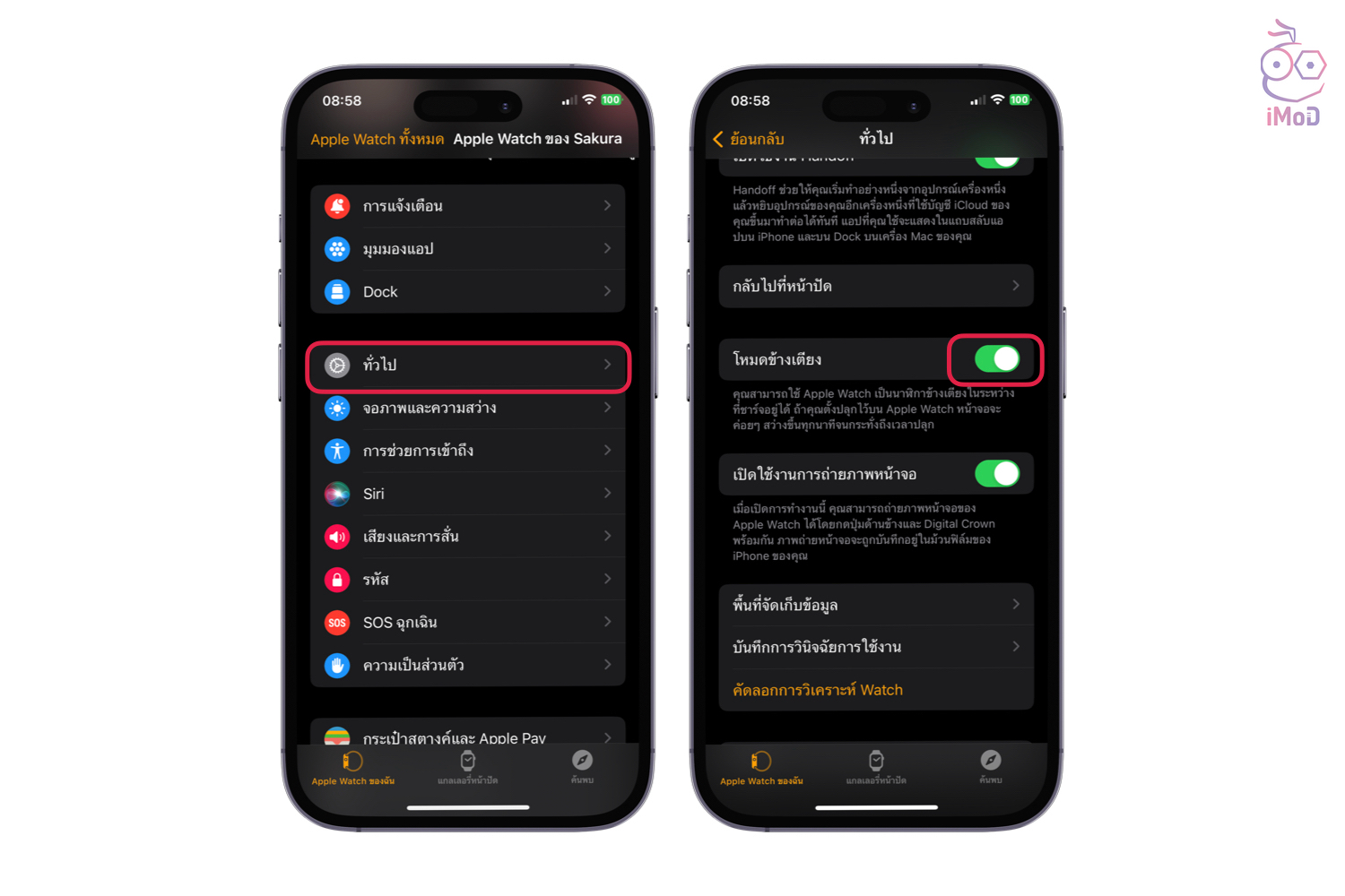 หรือจะตั้งค่าบน iPhone ก็ได้ ไปที่แอป Watch > ทั่วไป (General) > แตะเปิดหรือปิด โหมดข้างเตียง (Nightstand Mode)