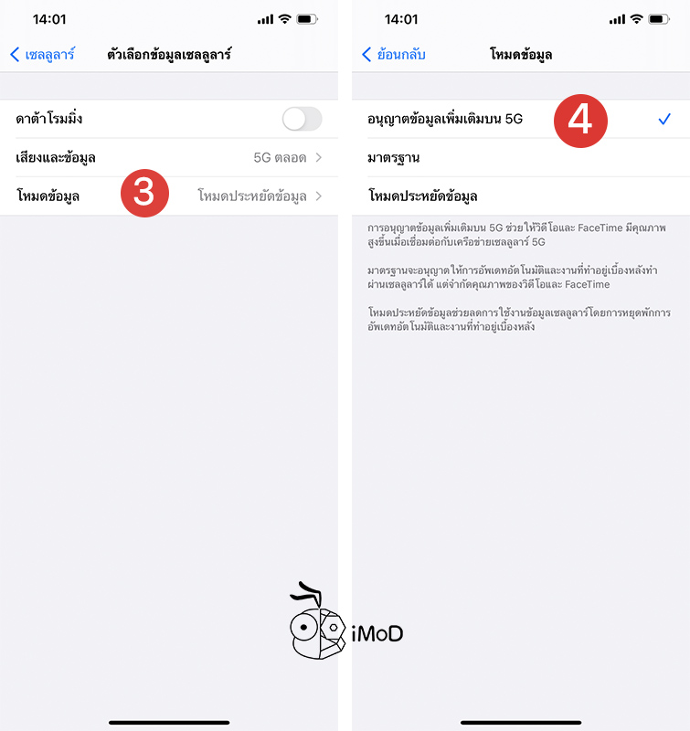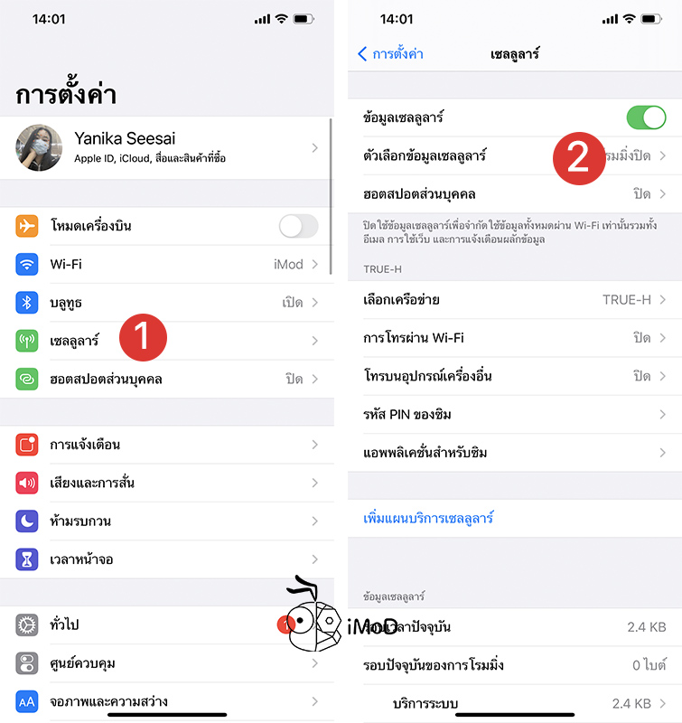 ไปที่ การตั้งค่า (Settings) > เซลลูลาร์ (Cellular) > ตัวเลือกข้อมูลเซลลูลาร์ (Cellular Option)