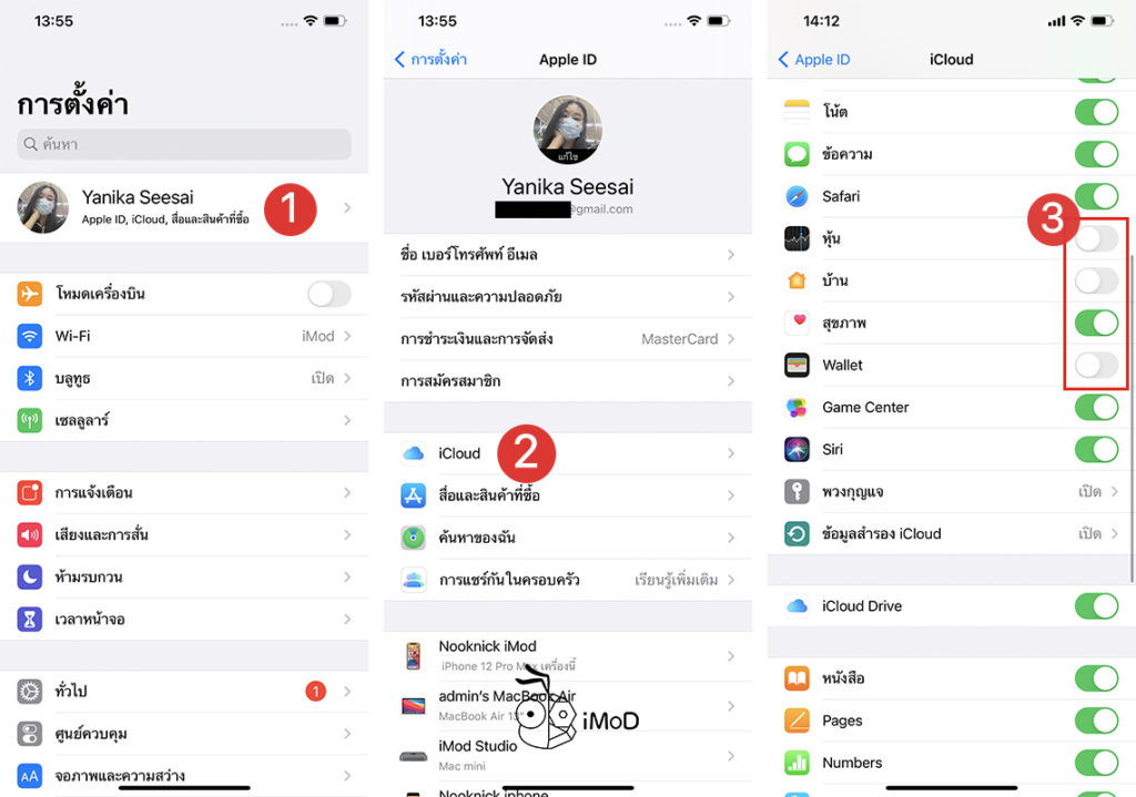 ไปที่ การตั้งค่า (Settings) > Apple ID > iCloud > เลื่อนปิดแอปที่เราไม่จำเป็นจะต้องใช้งาน iCloud