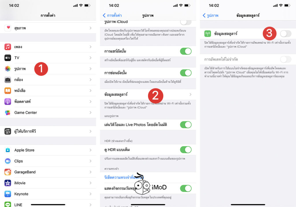ไปที่ การตั้งค่า (Settings) > รูปภาพ (Photos) > ปิด ข้อมูลเซลลูลาร์ (Cellular Data)