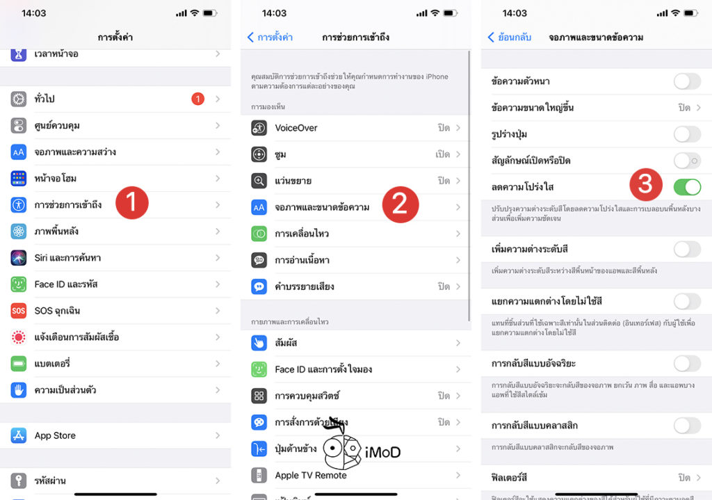 ไปที่ การตั้งค่า (Settings) > การช่วยการเข้าถึง (Accessibility) > จอภาพและขนาดข้อความ > เปิดลดความโปร่งใส (Reduce Transparency)