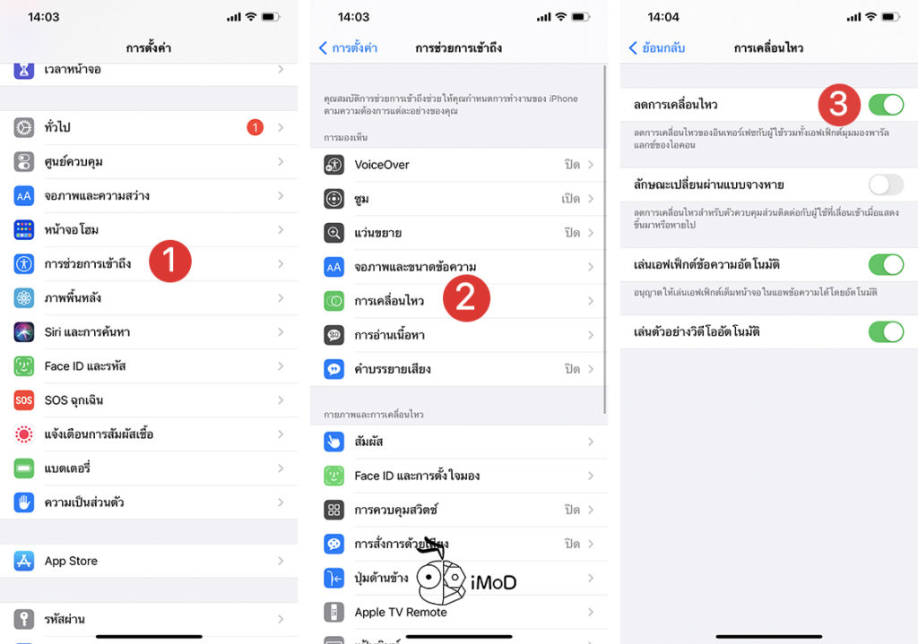 ไปที่ การตั้งค่า (Settings) > การช่วยการเข้าถึง (Accessibility) > การเคลื่อนไหว (Motion) > เปิด ลดการเคลื่อนไหว (Reduce Motion)